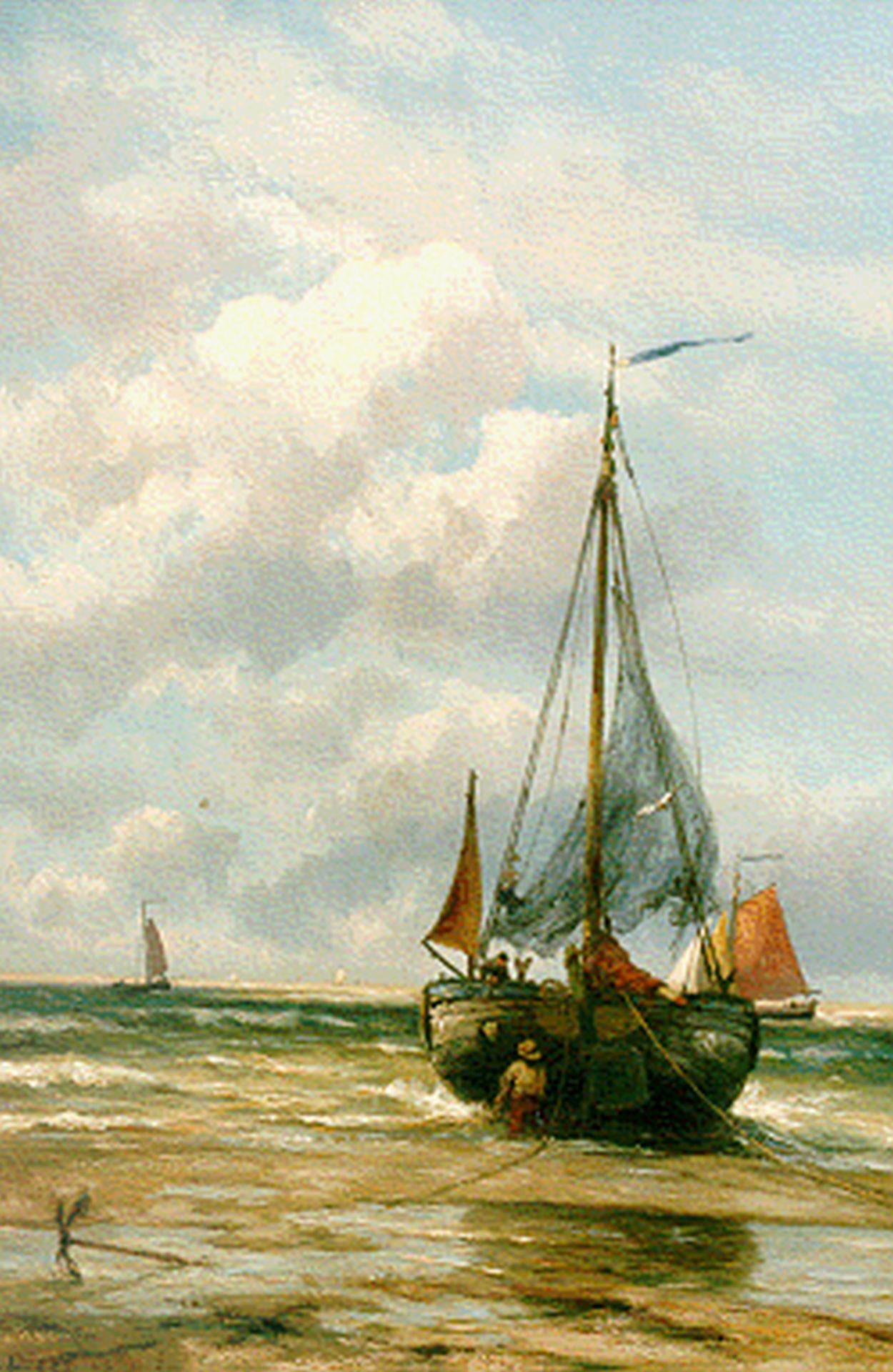 Jan H.B. Koekkoek, der dritte Sohn des Marinemalers Hermanus Koekkoek Sr., war der vielseitigste der vier Söhne von Hermanus Koekkoek. Auch er wurde von seinem Vater unterrichtet, dessen Einfluss noch heute deutlich im sorgfältigen Malstil und den feinen Details seiner frühen See- und Flussansichten zu erkennen ist. In späteren Jahren gründete Jan H.B. immer mehr im Einklang mit der Haager Schule zog er nach Gooi und malte Strand- und Meereslandschaften sowie Szenen aus dem Fischerleben in einem lockeren Malstil und einer hellen Farbpalette. Damit ist er ein gutes Beispiel dafür, wie sich die Malerei Ende des 19. Jahrhunderts veränderte. Obwohl die 'Romantik' noch nicht aus seinen Gemälden verschwunden war, ist klar, dass langsam eine neue Ära anbrechen würde.