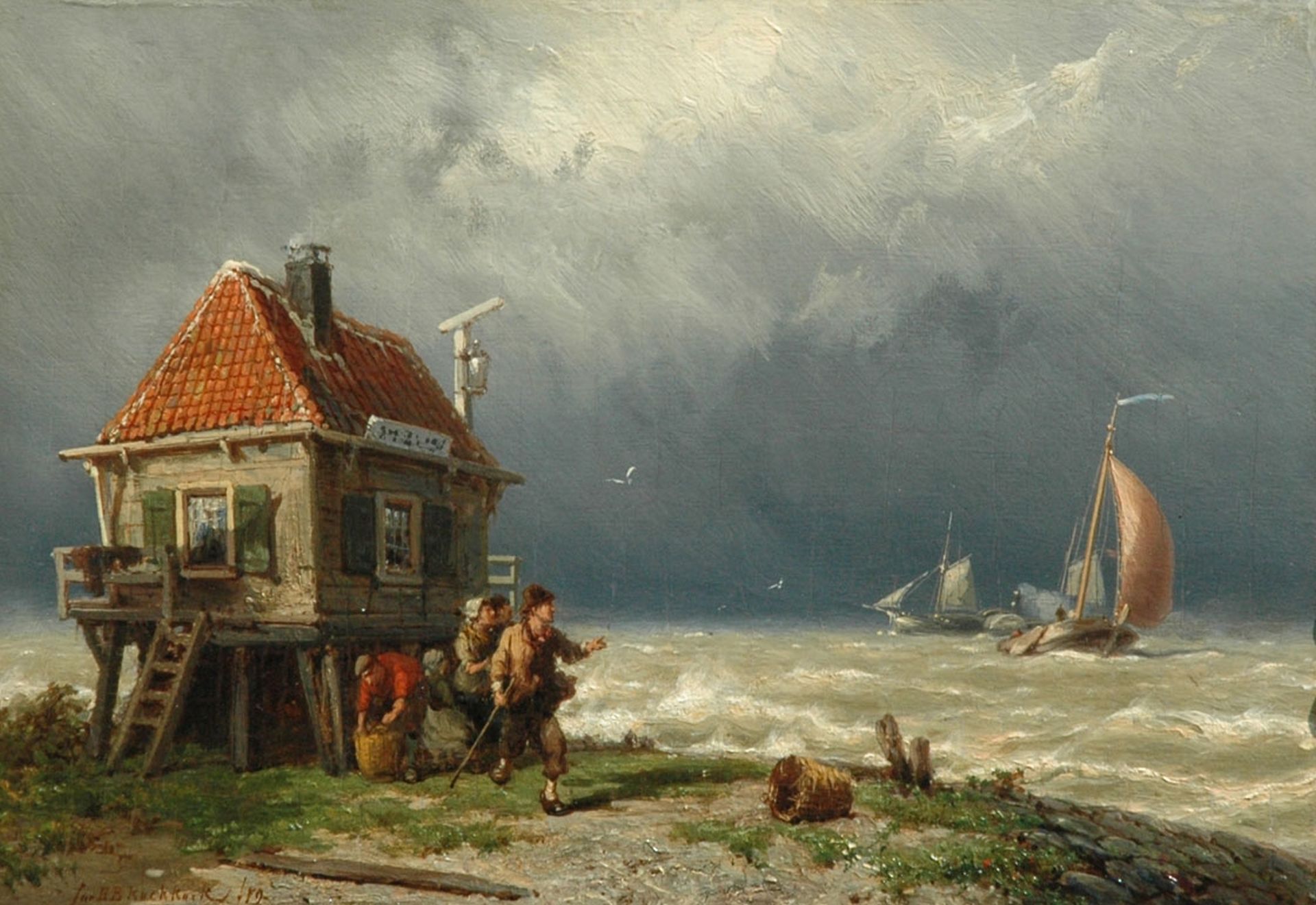 Jan H.B. Koekkoek, der dritte Sohn des Marinemalers Hermanus Koekkoek Sr., war der vielseitigste der vier Söhne von Hermanus Koekkoek. Auch er wurde von seinem Vater unterrichtet, dessen Einfluss noch heute deutlich im sorgfältigen Malstil und den feinen Details seiner frühen See- und Flussansichten zu erkennen ist. In späteren Jahren gründete Jan H.B. immer mehr im Einklang mit der Haager Schule zog er nach Gooi und malte Strand- und Meereslandschaften sowie Szenen aus dem Fischerleben in einem lockeren Malstil und einer hellen Farbpalette. Damit ist er ein gutes Beispiel dafür, wie sich die Malerei Ende des 19. Jahrhunderts veränderte. Obwohl die 'Romantik' noch nicht aus seinen Gemälden verschwunden war, ist klar, dass langsam eine neue Ära anbrechen würde.