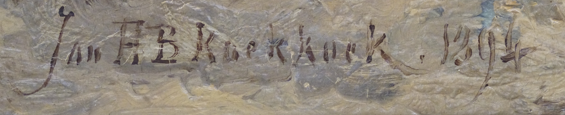Jan H.B. Koekkoek, der dritte Sohn des Marinemalers Hermanus Koekkoek Sr., war der vielseitigste der vier Söhne von Hermanus Koekkoek. Auch er wurde von seinem Vater unterrichtet, dessen Einfluss noch heute deutlich im sorgfältigen Malstil und den feinen Details seiner frühen See- und Flussansichten zu erkennen ist. In späteren Jahren gründete Jan H.B. immer mehr im Einklang mit der Haager Schule zog er nach Gooi und malte Strand- und Meereslandschaften sowie Szenen aus dem Fischerleben in einem lockeren Malstil und einer hellen Farbpalette. Damit ist er ein gutes Beispiel dafür, wie sich die Malerei Ende des 19. Jahrhunderts veränderte. Obwohl die 'Romantik' noch nicht aus seinen Gemälden verschwunden war, ist klar, dass langsam eine neue Ära anbrechen würde.