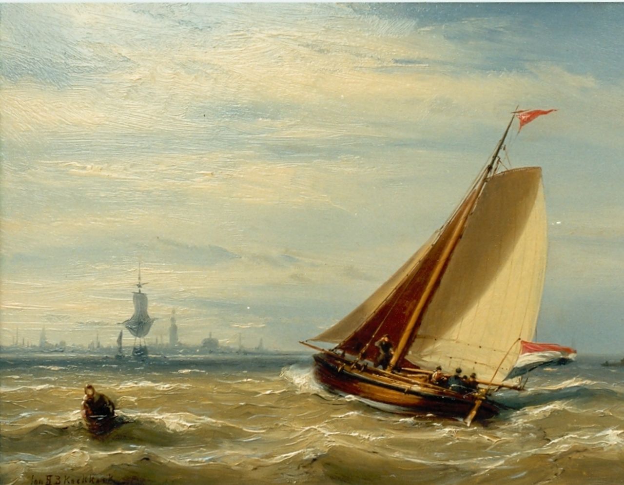 Jan H.B. Koekkoek, der dritte Sohn des Marinemalers Hermanus Koekkoek Sr., war der vielseitigste der vier Söhne von Hermanus Koekkoek. Auch er wurde von seinem Vater unterrichtet, dessen Einfluss noch heute deutlich im sorgfältigen Malstil und den feinen Details seiner frühen See- und Flussansichten zu erkennen ist. In späteren Jahren gründete Jan H.B. immer mehr im Einklang mit der Haager Schule zog er nach Gooi und malte Strand- und Meereslandschaften sowie Szenen aus dem Fischerleben in einem lockeren Malstil und einer hellen Farbpalette. Damit ist er ein gutes Beispiel dafür, wie sich die Malerei Ende des 19. Jahrhunderts veränderte. Obwohl die 'Romantik' noch nicht aus seinen Gemälden verschwunden war, ist klar, dass langsam eine neue Ära anbrechen würde.