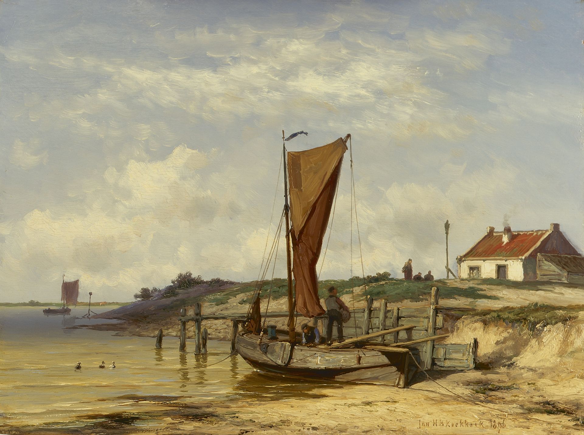 Jan H.B. Koekkoek, der dritte Sohn des Marinemalers Hermanus Koekkoek Sr., war der vielseitigste der vier Söhne von Hermanus Koekkoek. Auch er wurde von seinem Vater unterrichtet, dessen Einfluss noch heute deutlich im sorgfältigen Malstil und den feinen Details seiner frühen See- und Flussansichten zu erkennen ist. In späteren Jahren gründete Jan H.B. immer mehr im Einklang mit der Haager Schule zog er nach Gooi und malte Strand- und Meereslandschaften sowie Szenen aus dem Fischerleben in einem lockeren Malstil und einer hellen Farbpalette. Damit ist er ein gutes Beispiel dafür, wie sich die Malerei Ende des 19. Jahrhunderts veränderte. Obwohl die 'Romantik' noch nicht aus seinen Gemälden verschwunden war, ist klar, dass langsam eine neue Ära anbrechen würde.