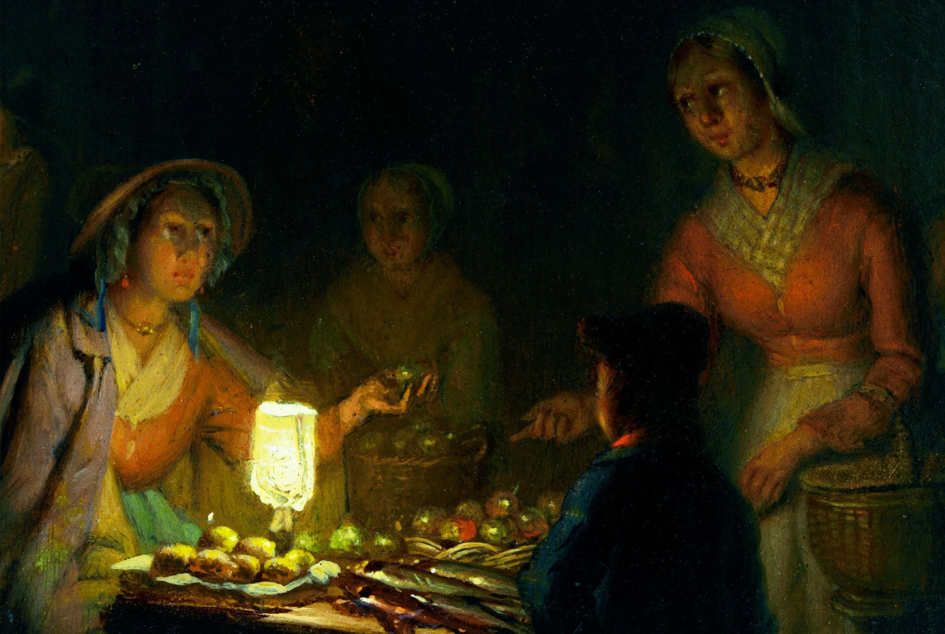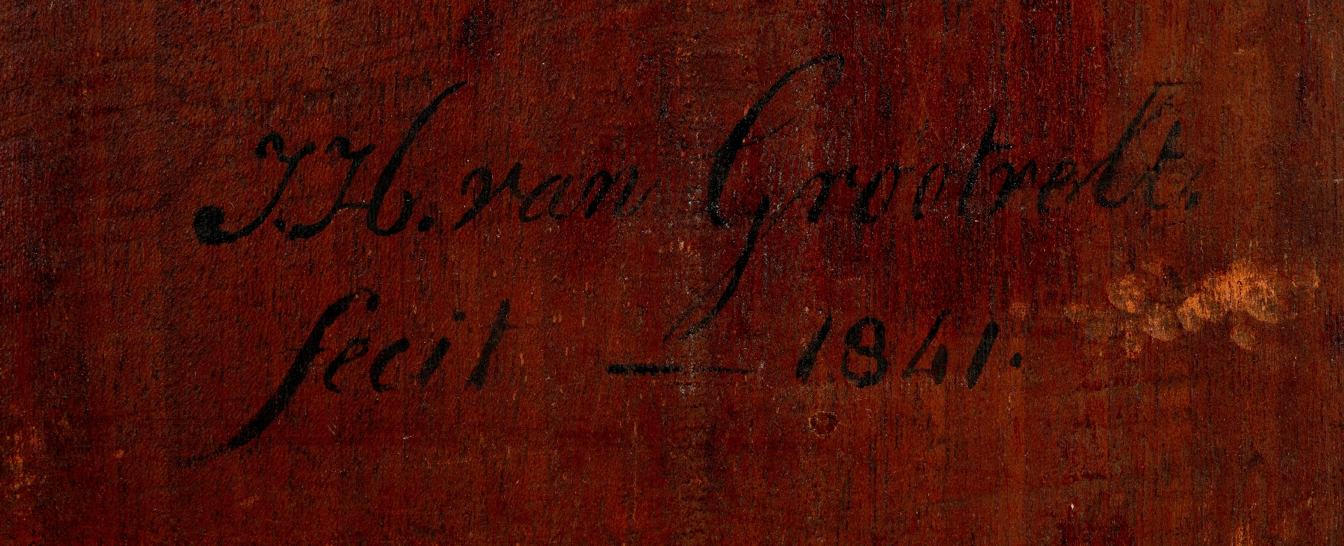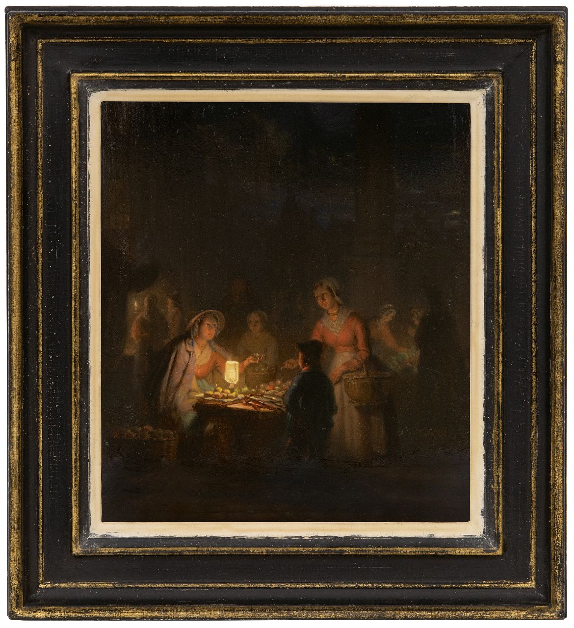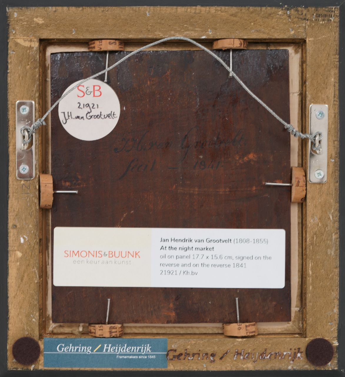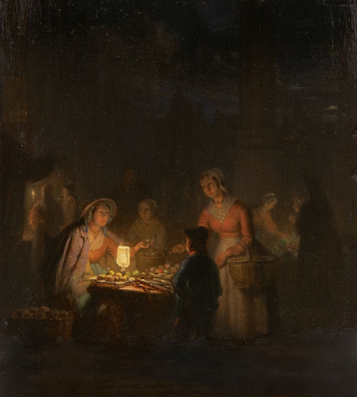 Die Faszination der romantischen Maler für die geheimnisvollen Naturgewalten führte Mitte des 19. Jahrhunderts zur Wiederbelebung des Genres der Nachtlandschaft aus dem 17. Jahrhundert, auch „Nocturne“ genannt. Jan Hendrik van Grootvelt spezialisierte sich auch auf die Malerei von Innenräumen und Straßen- und Marktszenen bei Kerzen- und Lampenlicht. Er wurde an der Royal School in Den Bosch ausgebildet. Sein malerisches Talent wurde schon früh belohnt: Im Schuljahr 1826/27 wurde er für seine Arbeit mit einer Medaille ausgezeichnet. Van Grootvelt reichte seine Arbeiten zwischen 1830 und 1837 regelmäßig für die jährliche Ausstellung lebender Meister ein; Seine Arbeiten wurden unter anderem in Den Bosch, Amsterdam, Den Haag und Rotterdam einem großen Publikum gezeigt. Meer over deze brontekstBrontekst vereist voor aanvullende vertaalinformatie Feedback sturen Zijvensters