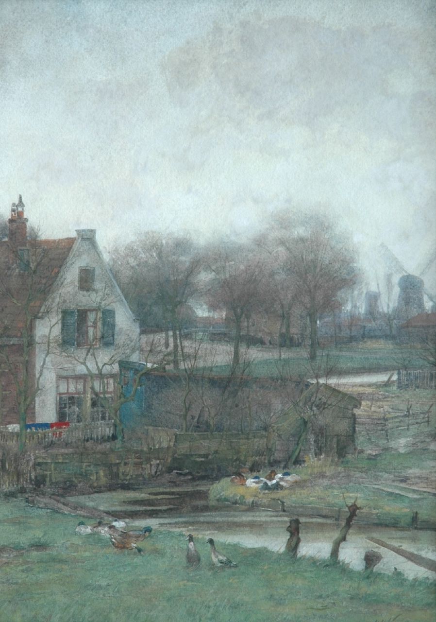 Jan Hillebrand Wijsmuller Kunstwerk • Aquarell • Zeichnung • zuvor zu verkaufen A view of a farm, windmills beyond