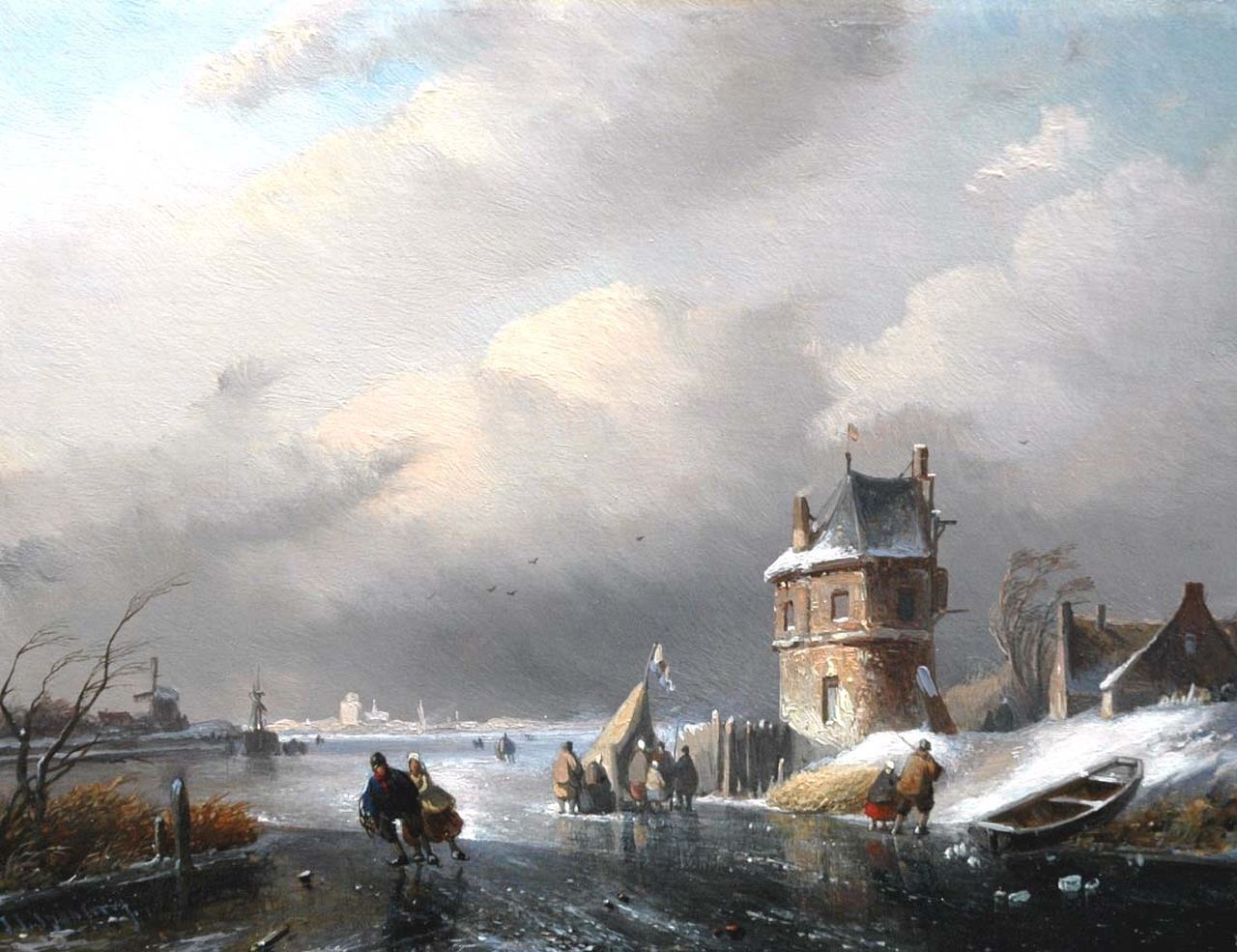 Jan Jacob Spohler Kunstwerk • Gemälde • zuvor zu verkaufen A winter landscape with figures by a 'koek en zopie'