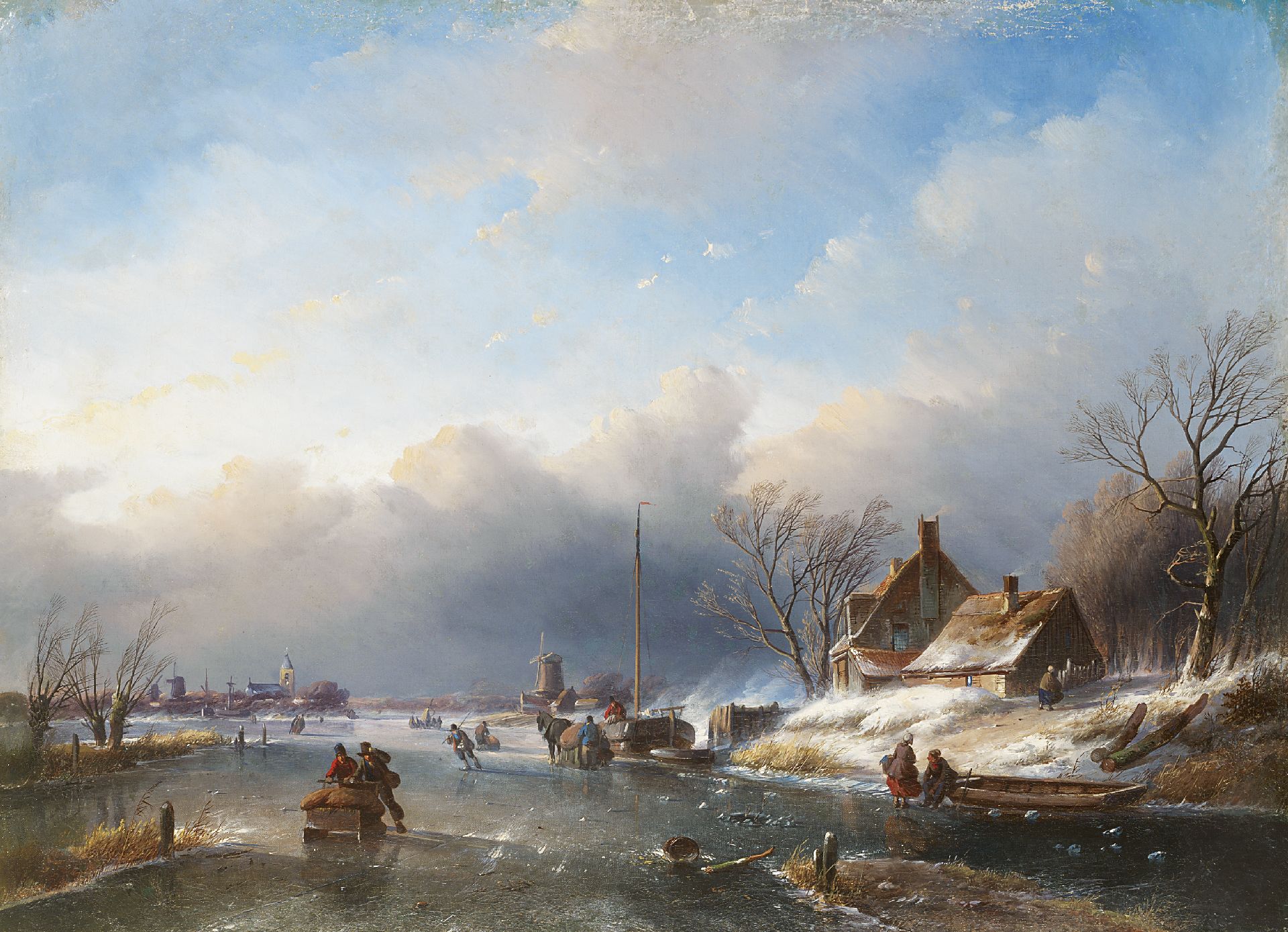 A winter's landscape with figures on the ice