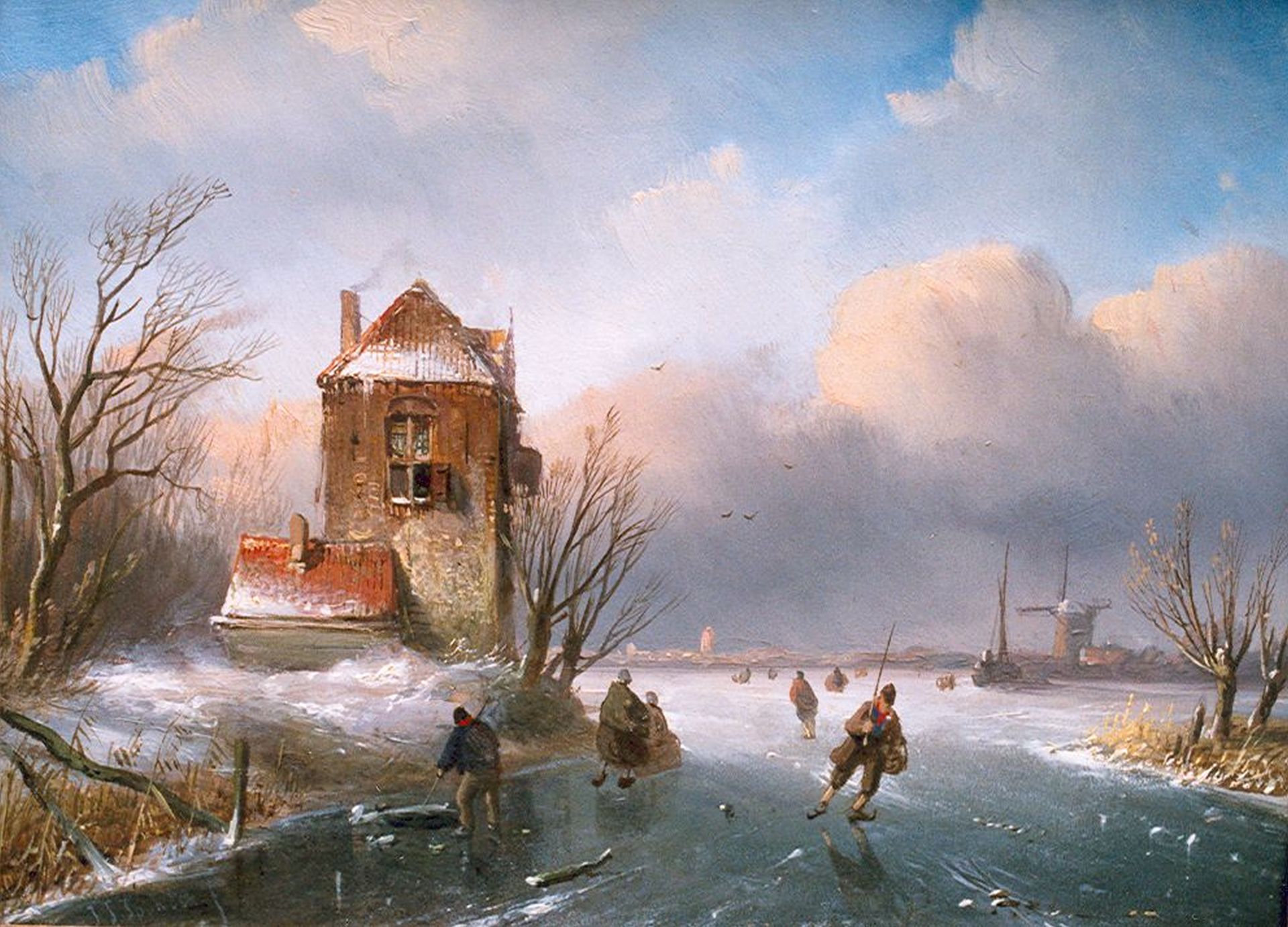 Jan Jacob Spohler Kunstwerk • Gemälde • zuvor zu verkaufen Skaters on a frozen waterway