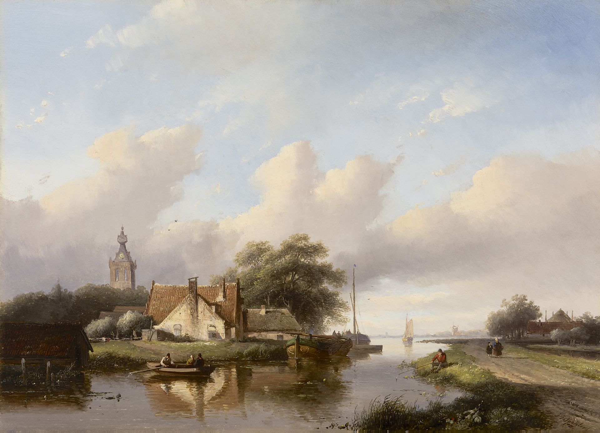 Jan Jacob Spohler | Sommerlandschaft mit Figuren an einem Kanal, Öl auf Leinwand, 56,6 x 78,4 cm, Unterzeichnet u.l.