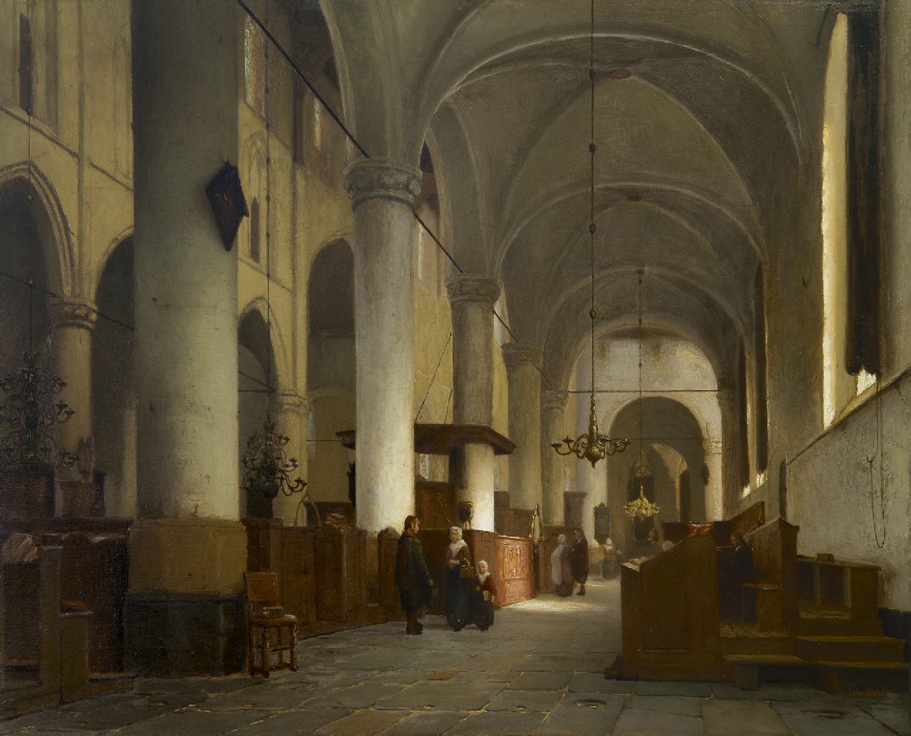 Jan Jacob Schenkel lebte und arbeitete in Amsterdam. Er wurde von den Historien- und Figurenmalern Valentijn Bing und Jan Braet von Uberfeldt unterrichtet, folgte seinen Lehrern jedoch nicht in ihrer Spezialisierung: Sein Werk besteht hauptsächlich aus Kircheninnenräumen. Er malte auch Stadtbilder. In der Zeit von 1851 bis 1899 stellte Schenkel seine Werke regelmäßig aus, in Rotterdam, Den Haag und Amsterdam.