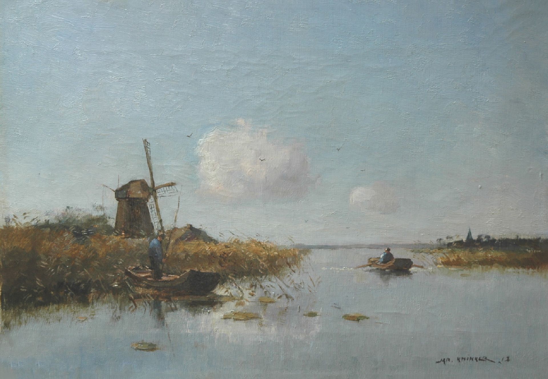 Jan Knikker sr. Kunstwerk • Gemälde • zuvor zu verkaufen Angler in Booten auf einem Polderwasser
