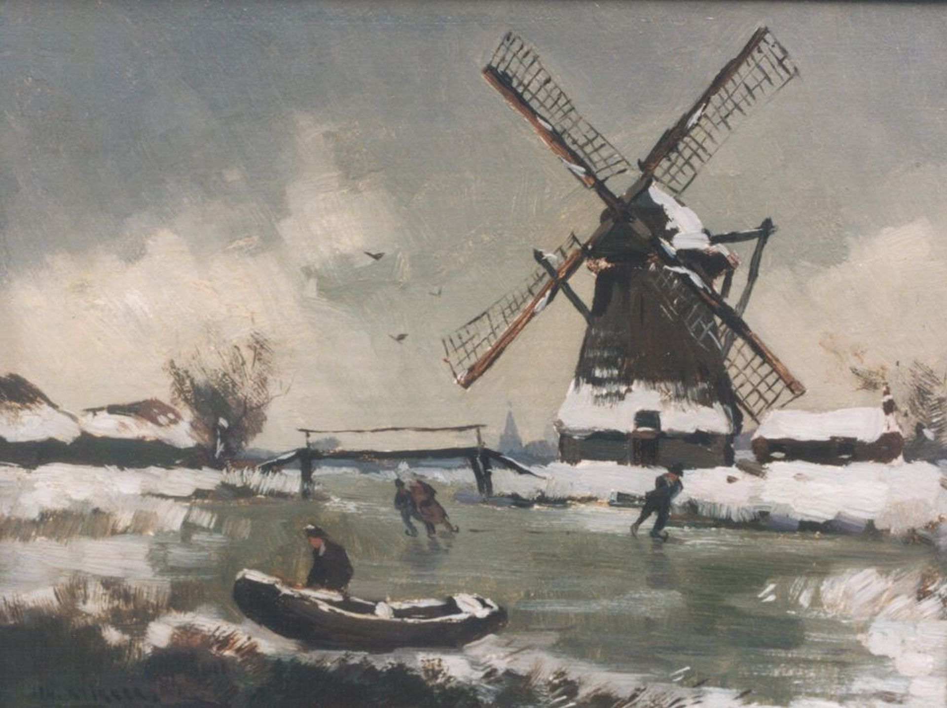Jan Knikker sr. Kunstwerk • Gemälde • zuvor zu verkaufen Skaters on a frozen waterway