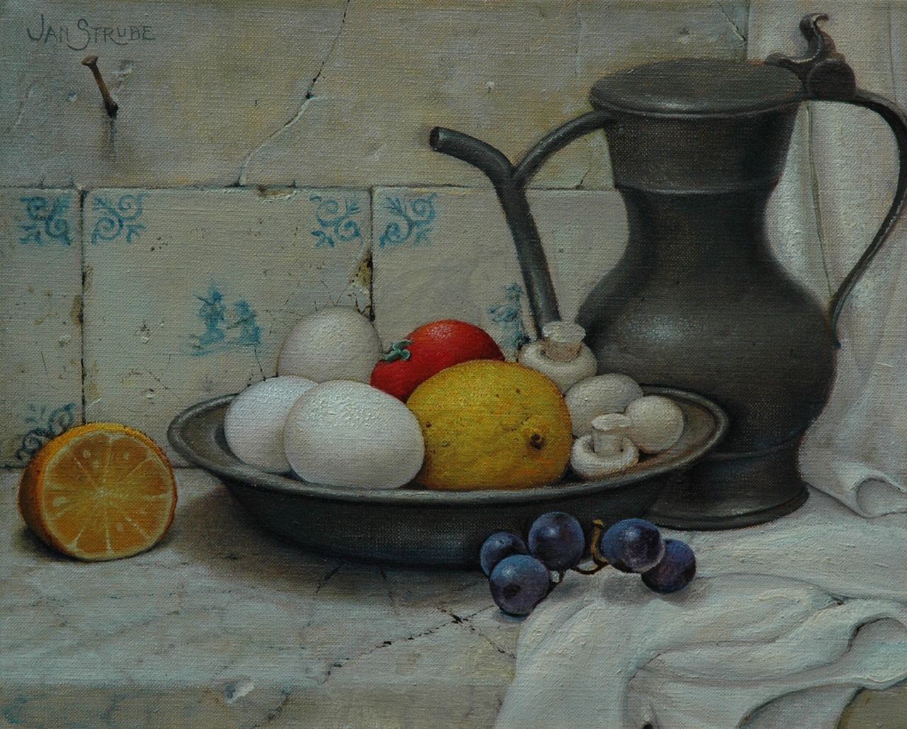 Jan Strube Kunstwerk • Gemälde • zuvor zu verkaufen A still life with fruit and a pewter jug