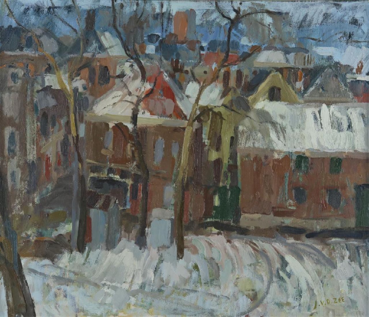 Jan van der Zee gehört zu den meist talentierten Maler der Groninger Ploeg. Im Jahre 1923, als er Mitglied dieses Künstlervereins wurde, malte er einige Zeit geometrisch-abstrakte Kompositionen. Namentlich wegen der negativen Kritik auf diese Werke ging er 1926 auf die Malerei von Groninger Landschaften, Porträts und Stilleben über. Diese Werke kann man am besten beschreiben als ‚irdisch‘: sie sind kräftig, stark von der Landschaftsstruktur her und in einem kräftigen, expressionistischen Pinselstrich gemalt. Oft ist da eine deutliche Aufmerksamkeit für die Struktur in der Landschat und den Rhythmus der aufeinander folgenden Formen und Flächen. Es ist daher auch nicht wunderlich, dass die Werke des Malers in den fünfziger Jahren einen immer mehr abstrakten Charakter vorzeigt.