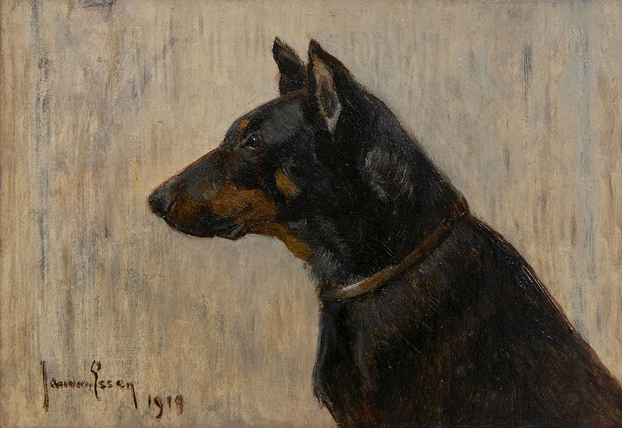 Jan van Essen ist der bekannteste niederländische Tiermaler aus der zweiten Hälfte des 19. Jahrhunderts. Anfangs malte er Landschaften und Stadtlandschaften, aber unter dem Einfluss des englischen Tiermalers J. Swan begann er sich ab 1885 auch auf Tiere zu konzentrieren. Er machte viele Studien über Vögel und Löwen im Amsterdamer Artis Zoo. An Wertschätzung mangelte es ihm nie, denn seine Arbeiten wurden auf Ausstellungen in Amsterdam, Deutschland, Frankreich und Australien ausgezeichnet. Van Essen lernte die Kunst des Malens von Johan Conrad Greive (1837-1891), einem Maler mit Blick auf den Fluss und die Stadt. Er arbeitete auch kurze Zeit im Atelier des Genremalers Hendrik Valkenburg (1826-1896). Nach 1890 malte er auch Jagdszenen.