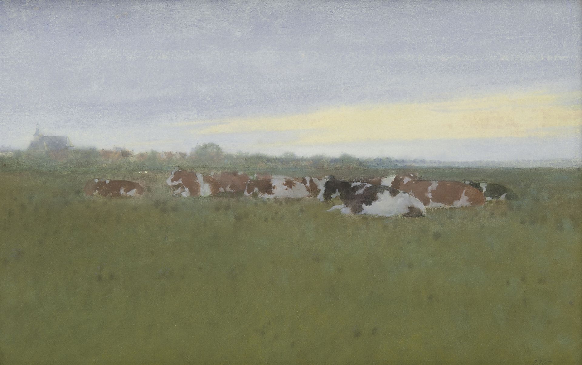 Jan Voerman sr. Kunstwerk • Aquarell • Zeichnung • zuvor zu verkaufen Resting cows in the meadows, Hattem