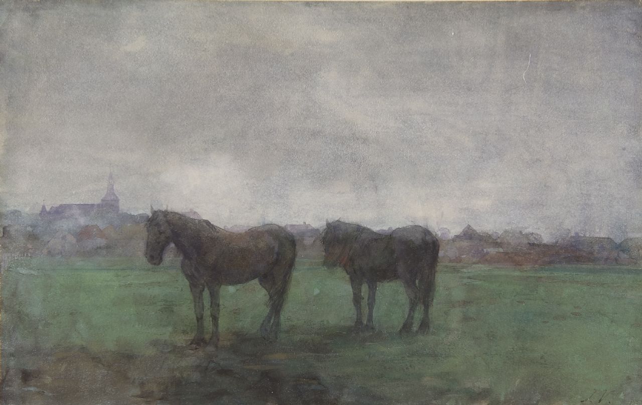 Jan Voerman sr. Kunstwerk • Aquarell • Zeichnung • zuvor zu verkaufen Two horses in a meadow, near Hattem