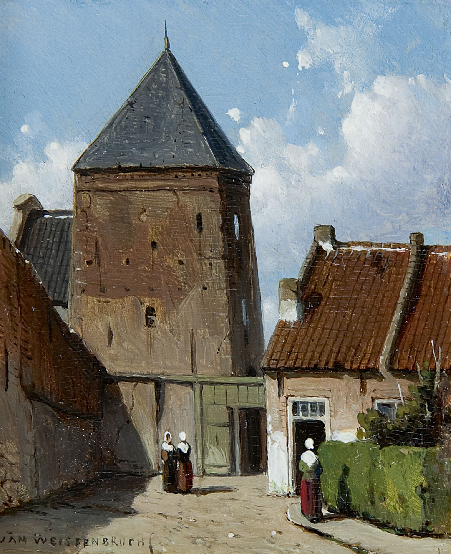 Jan Weissenbruch war einer der wichtigsten Vertreter des Realismus in der holländischen Malerei der 1850er und 60er Jahre. Er wurde an der Haager Zeichenakademie unterrichtet und spezialisierte sich dann auf das Malen von Straßenszenen in unseren alten Städten und Städten an den großen Flüssen. Sein Werk steht in der romantischen Tradition, aber der Maler löste sich allmählich von dieser zugunsten einer impressionistischeren Herangehensweise. Er hat ein Auge für Licht und Atmosphäre, die später von den Malern der Haager Schule weiterentwickelt wurden.