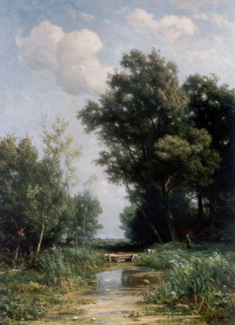 Jan Willem van Borselen Kunstwerk • Gemälde • zuvor zu verkaufen A polder landscape with a hunter and dog