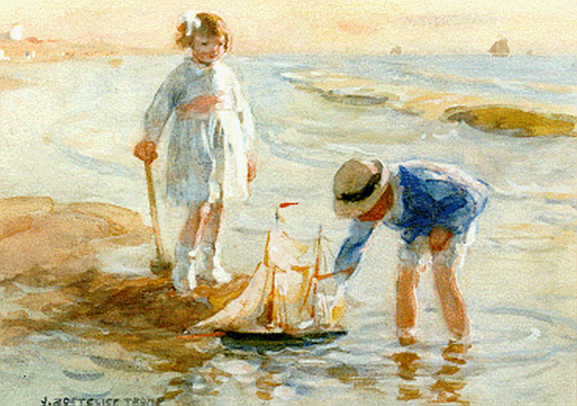 Blaricum und Katwijk waren die zwei Dörfer wo Jan Zoetelief Tromp am meisten malte. In Blaricum fand er ab 1899 das Bauernleben, Katwijk‚ entdeckte‘ er im Jahre 1905. Zunächst verbringt er dort nur die Sommerzeiten mit seiner Familie, ab 1914 wohnt er dort permanent. Er malt hier das Leben der Fischerbevölkerung, aber vor allen Dingen Vorstellungen mit Kindern: spielend auf dem Strand, Ziegen hütend oder rückkehrend aus den Dünen. Diese Szenen sind immer idyllisch und strahlen das Familienglück aus, das er vermutlich selber auch kannte. Weil der Maler taub war und einigermassen zurückgezogen lebte, wählte er seine Frau und Kinder am liebsten als Modell.