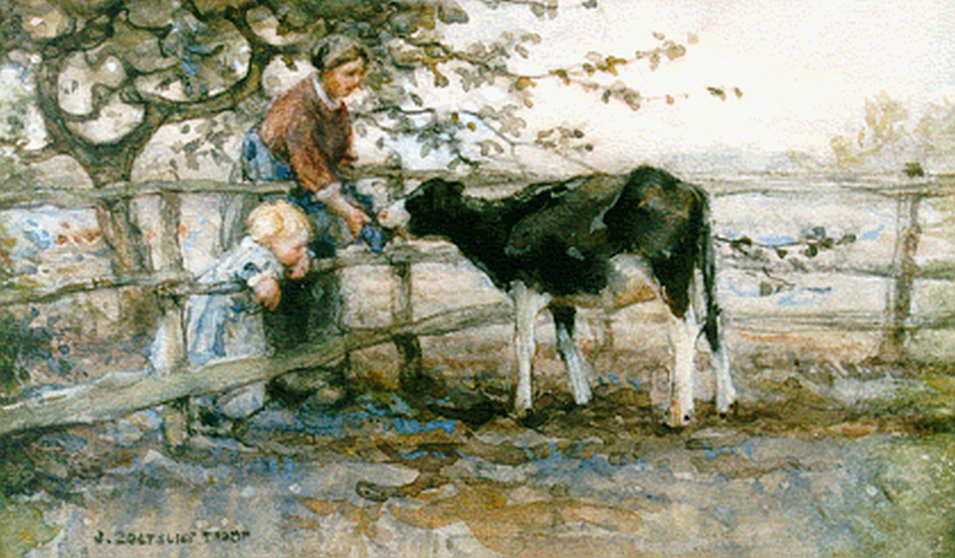 Jan Zoetelief Tromp Kunstwerk • Aquarell • Zeichnung • zuvor zu verkaufen Feeding a calf