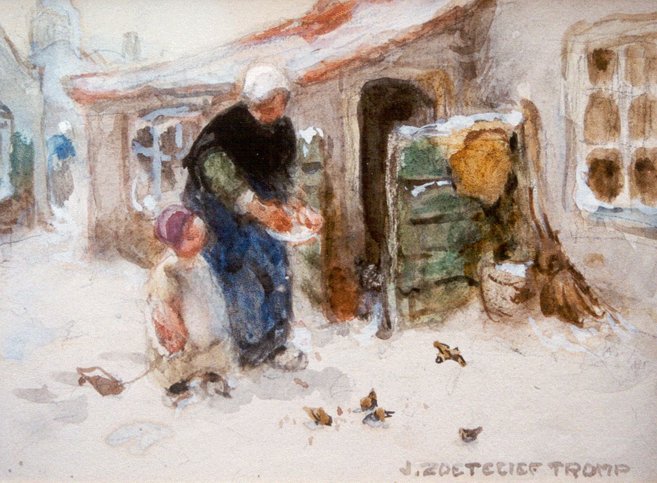 Zoetelief Tromp J.  | Johannes 'Jan' Zoetelief Tromp, Feeding the birds in winter, Aquarell auf Papier 14,5 x 19,0 cm, signed l.r.