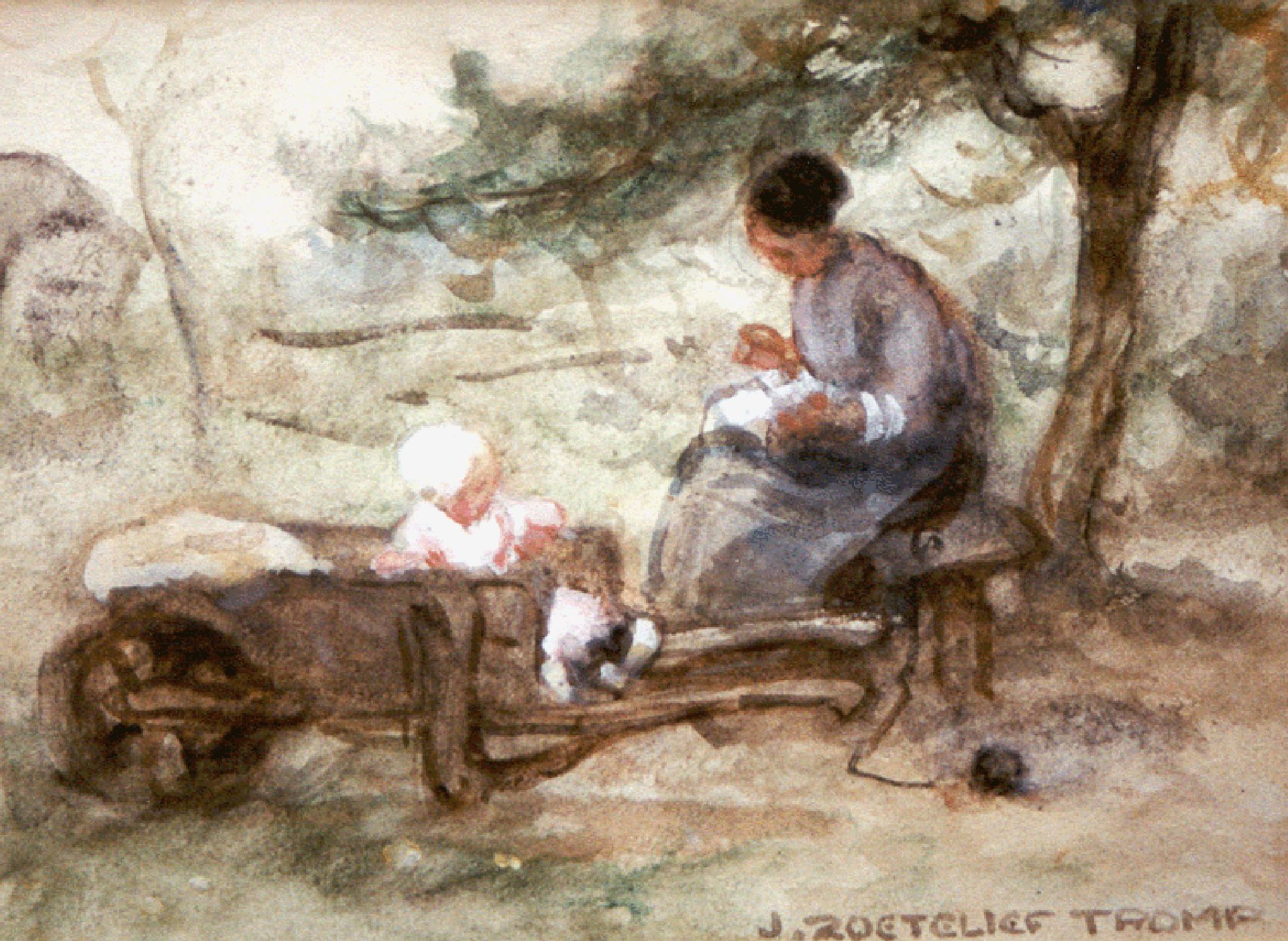 Blaricum und Katwijk waren die zwei Dörfer wo Jan Zoetelief Tromp am meisten malte. In Blaricum fand er ab 1899 das Bauernleben, Katwijk‚ entdeckte‘ er im Jahre 1905. Zunächst verbringt er dort nur die Sommerzeiten mit seiner Familie, ab 1914 wohnt er dort permanent. Er malt hier das Leben der Fischerbevölkerung, aber vor allen Dingen Vorstellungen mit Kindern: spielend auf dem Strand, Ziegen hütend oder rückkehrend aus den Dünen. Diese Szenen sind immer idyllisch und strahlen das Familienglück aus, das er vermutlich selber auch kannte. Weil der Maler taub war und einigermassen zurückgezogen lebte, wählte er seine Frau und Kinder am liebsten als Modell.