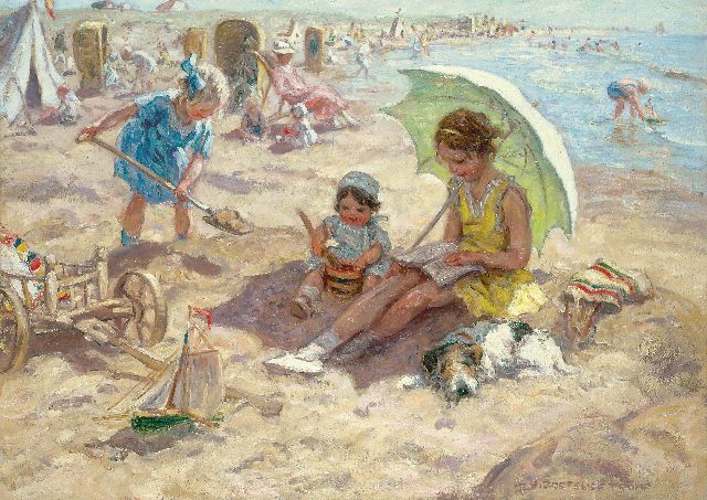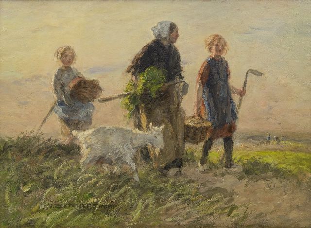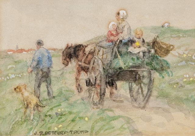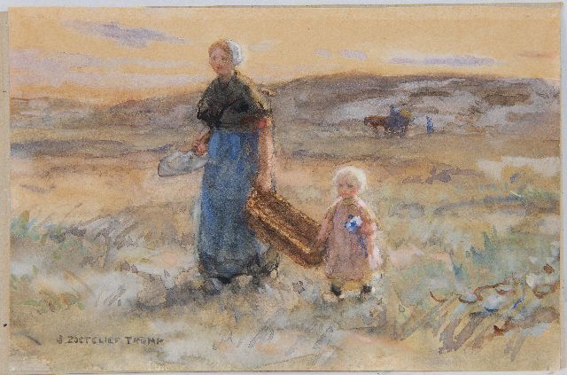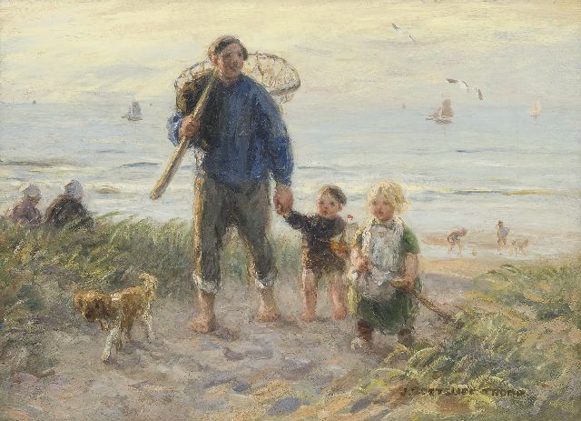 Blaricum und Katwijk waren die zwei Dörfer wo Jan Zoetelief Tromp am meisten malte. In Blaricum fand er ab 1899 das Bauernleben, Katwijk‚ entdeckte‘ er im Jahre 1905. Zunächst verbringt er dort nur die Sommerzeiten mit seiner Familie, ab 1914 wohnt er dort permanent. Er malt hier das Leben der Fischerbevölkerung, aber vor allen Dingen Vorstellungen mit Kindern: spielend auf dem Strand, Ziegen hütend oder rückkehrend aus den Dünen. Diese Szenen sind immer idyllisch und strahlen das Familienglück aus, das er vermutlich selber auch kannte. Weil der Maler taub war und einigermassen zurückgezogen lebte, wählte er seine Frau und Kinder am liebsten als Modell.