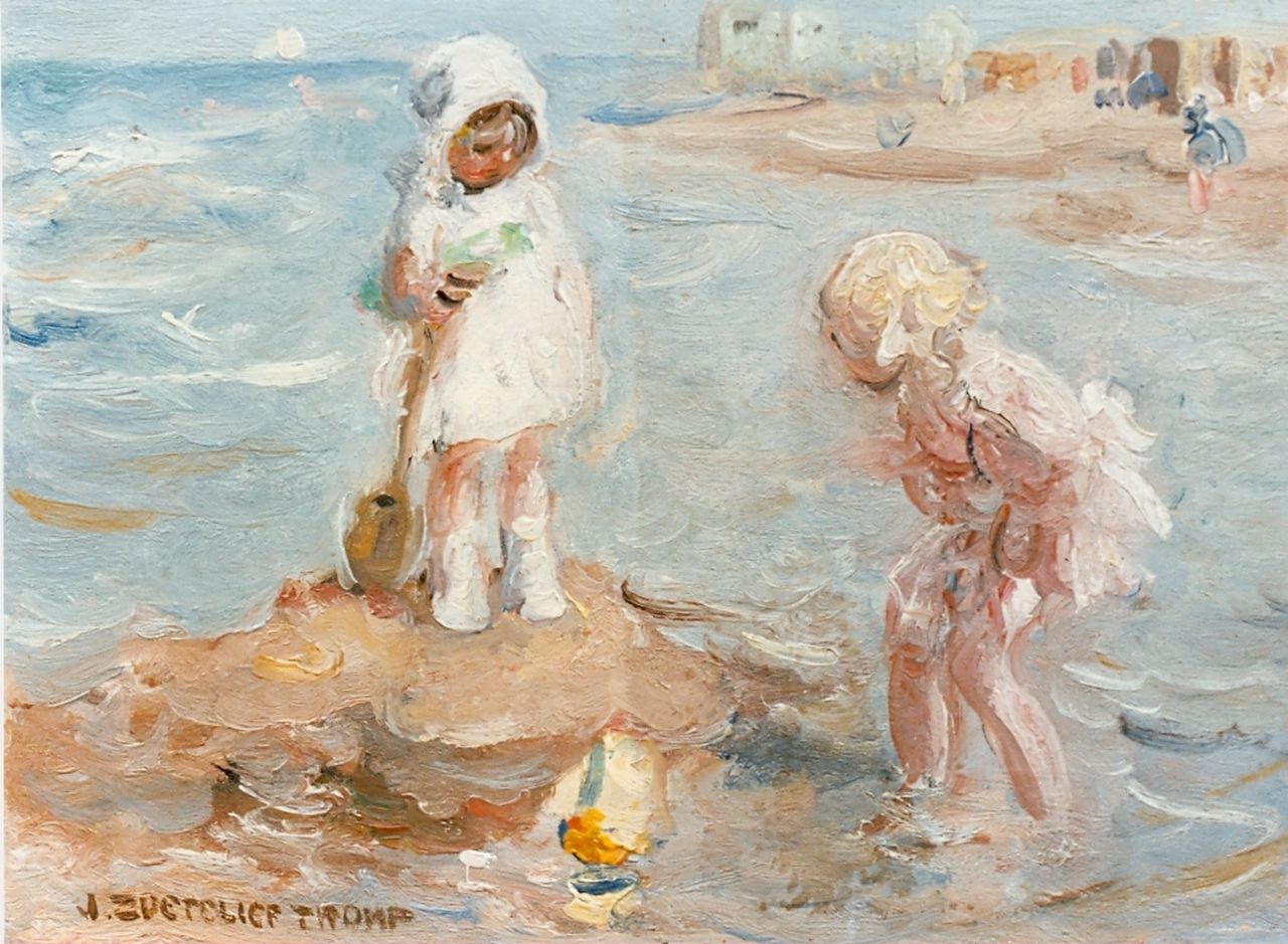 Blaricum und Katwijk waren die zwei Dörfer wo Jan Zoetelief Tromp am meisten malte. In Blaricum fand er ab 1899 das Bauernleben, Katwijk‚ entdeckte‘ er im Jahre 1905. Zunächst verbringt er dort nur die Sommerzeiten mit seiner Familie, ab 1914 wohnt er dort permanent. Er malt hier das Leben der Fischerbevölkerung, aber vor allen Dingen Vorstellungen mit Kindern: spielend auf dem Strand, Ziegen hütend oder rückkehrend aus den Dünen. Diese Szenen sind immer idyllisch und strahlen das Familienglück aus, das er vermutlich selber auch kannte. Weil der Maler taub war und einigermassen zurückgezogen lebte, wählte er seine Frau und Kinder am liebsten als Modell.