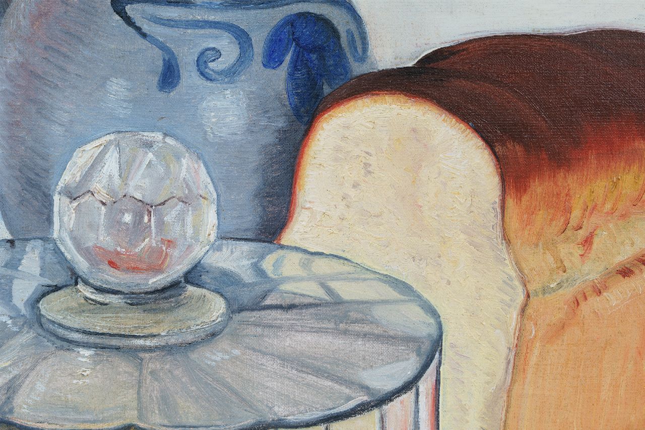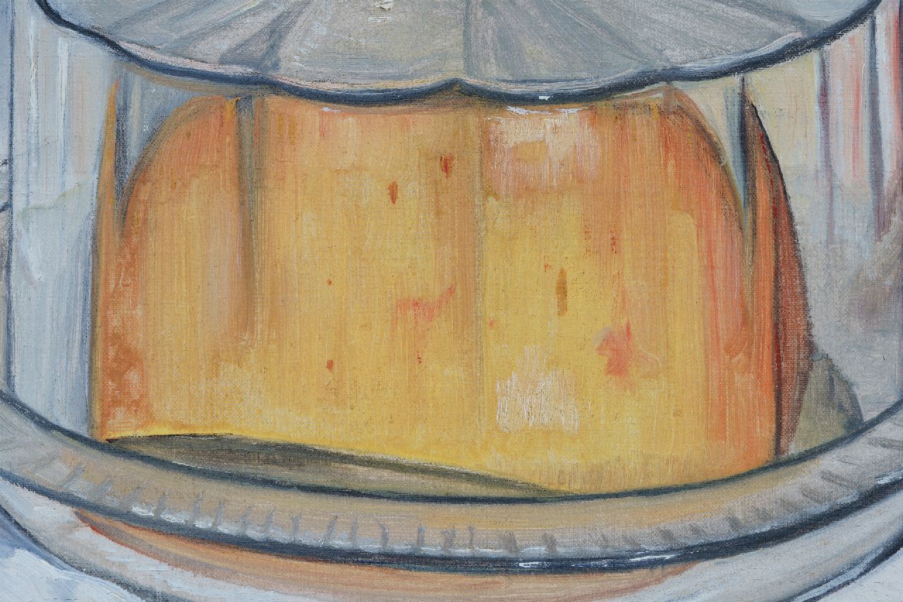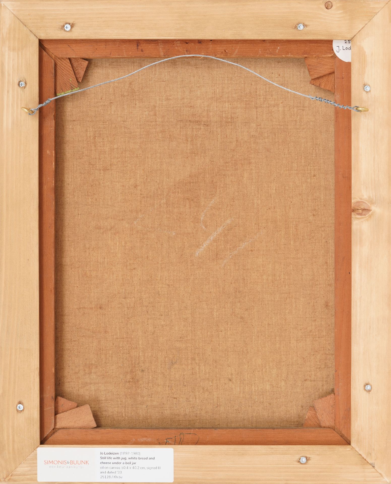 Jo Lodeizen Kunstwerk • Gemälde • zuvor zu verkaufen Stilleben mit Krug, Weißbrot und Käse unter einer Glasglocke
