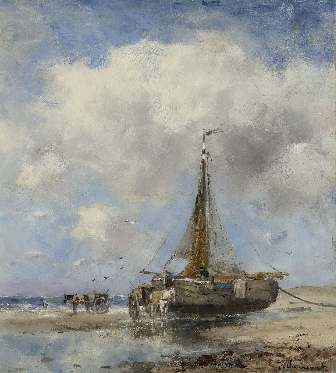 Johan Scherrewitz zählt zur zweite Blüte der Haager Schule. Er wurde 1868 in Amsterdam geboren, wo er Malunterricht beim Landschaftsmaler Geo Poggenbeek nahm. 1898 zog er nach Gooi. Scherrewitz liebte es, offene Waldlandschaften zu malen und wechselt dies mit Strandblicke in der Nähe von Katwijk. Kühe, Schafe und Pferde, Fischer mit ihren Schiffen und Muschelfischer mit Pferdewagen bevölkern seine Bilder. Scherrewitz hatte mit seiner Arbeit in England, Schottland und den USA fast sofort Erfolg.