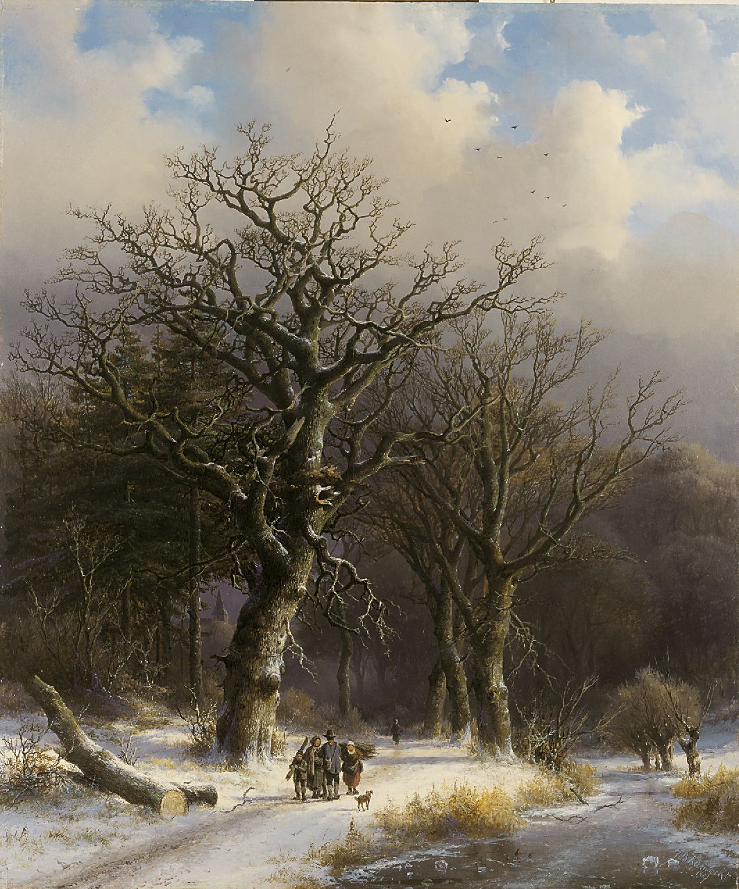 Johann Bernard Klombeck Kunstwerk • Gemälde • zuvor zu verkaufen Oak forest with wood gatherers in winter