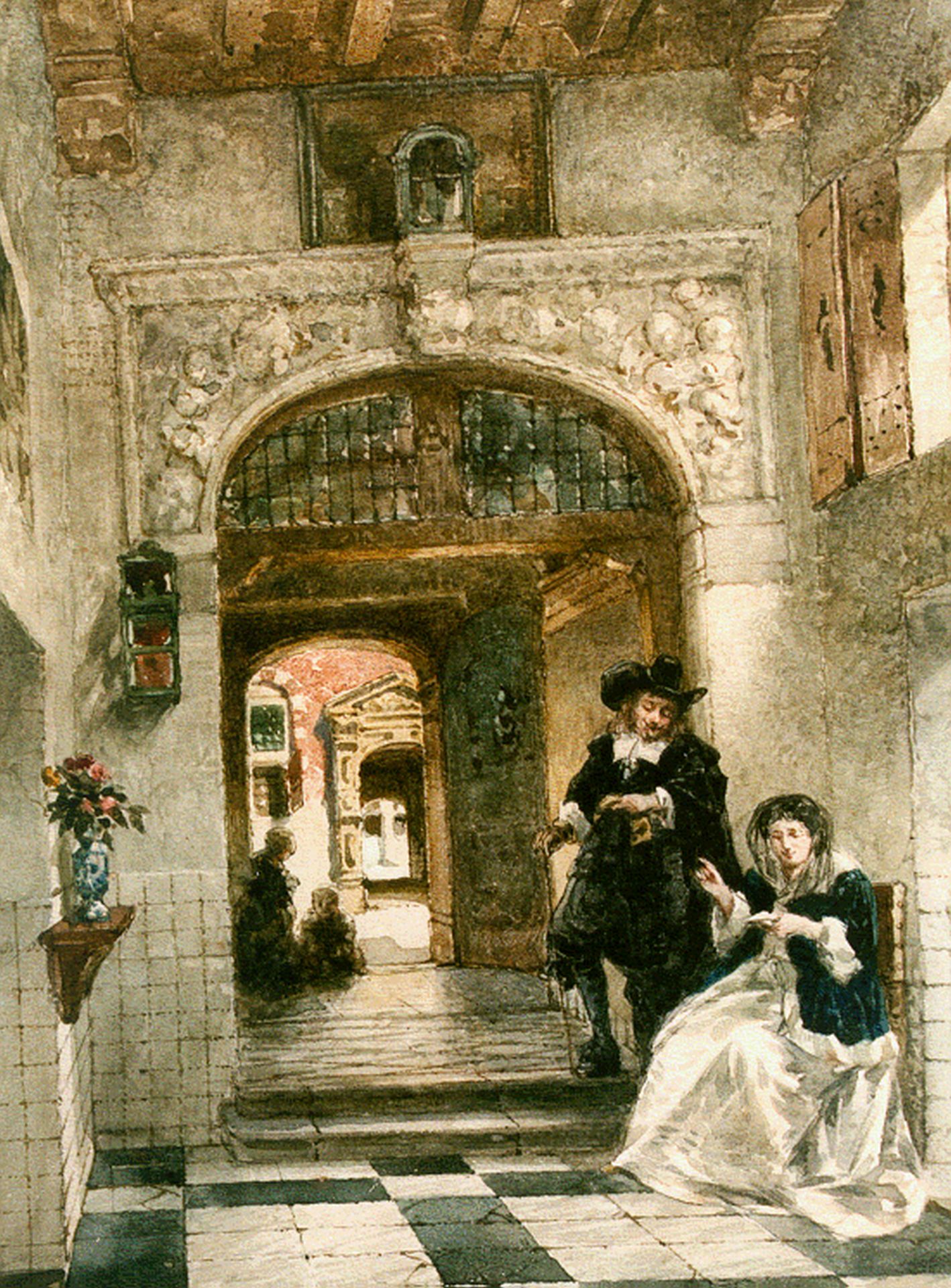 Johannes Anthonie Balthasar Stroebel Kunstwerk • Aquarell • Zeichnung • zuvor zu verkaufen Figures in a Dutch interior