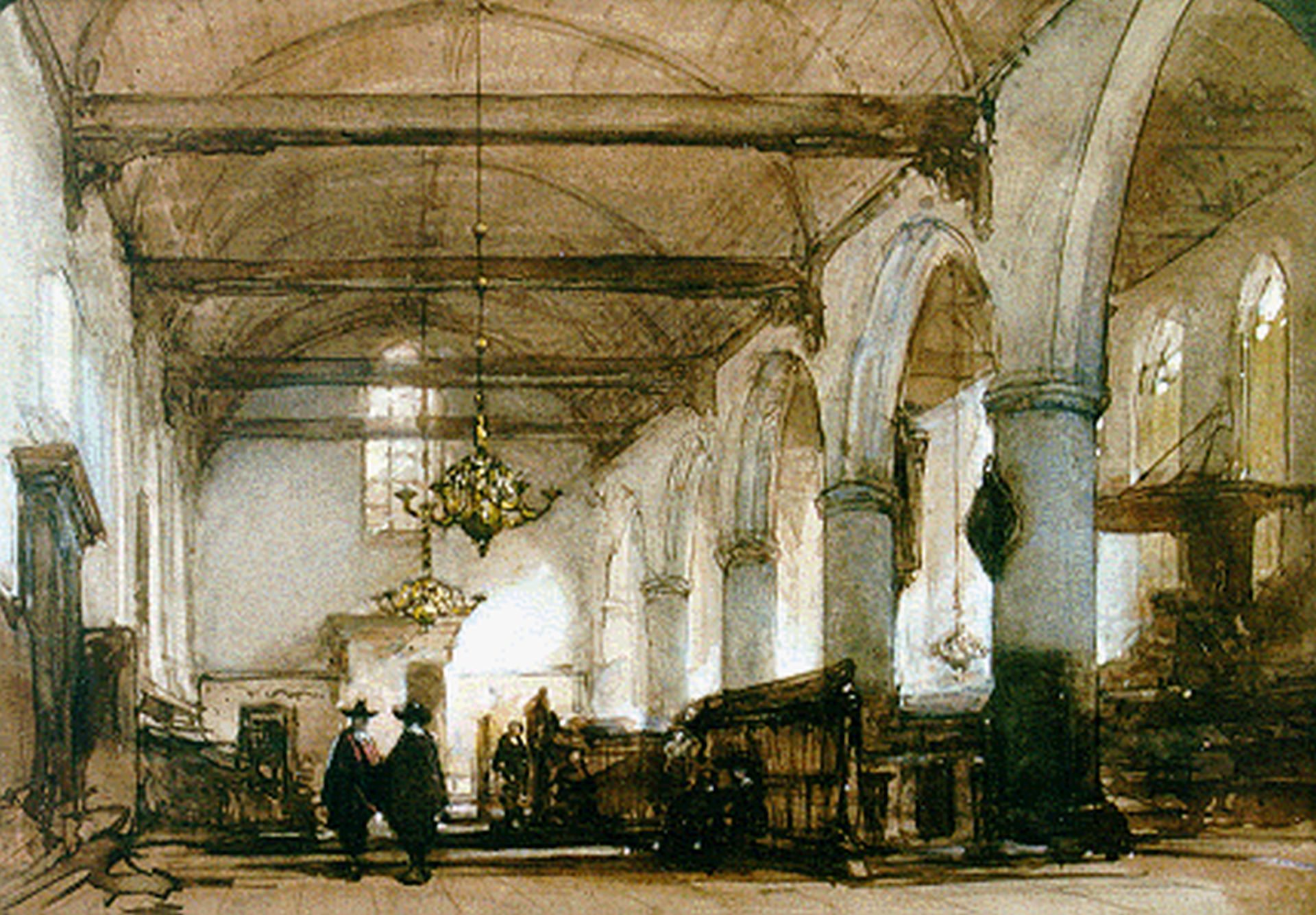Johannes Bosboom wurde 1817 im Haag geboren und ging in die Lehre bei dem Stadtansichtenmaler Bart van Hove. Er wählte sich schon bald den Kircheninnenraum als seine Spezialität, dazu durch die Belobigung seiner Zeitgenossen ermutigt. Seine Aquarelle und Gemälde zeigen verträumte Kircheninnenräume, von Figuren in Bekleidung des siebzehnten Jahrhunderts bevölkert. Als Repräsentant der ‘Haagse School’ versuchte er die Eindrücke wiederzugeben, die das Gebäude auf ihn machten. Ausserdem war er inspiriert von dem Lichteinfall und Atmosphäre im Werk der Maler Rembrandt und Emanuel de Witte aus dem siebzehnten Jahrhundert.