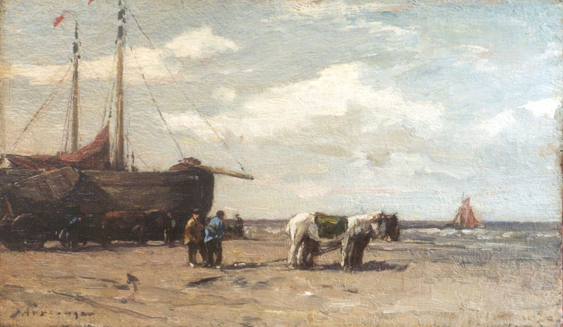 Johannes Evert Akkeringa Kunstwerk • Gemälde • zuvor zu verkaufen 'Bomschuiten' and figures on the beach