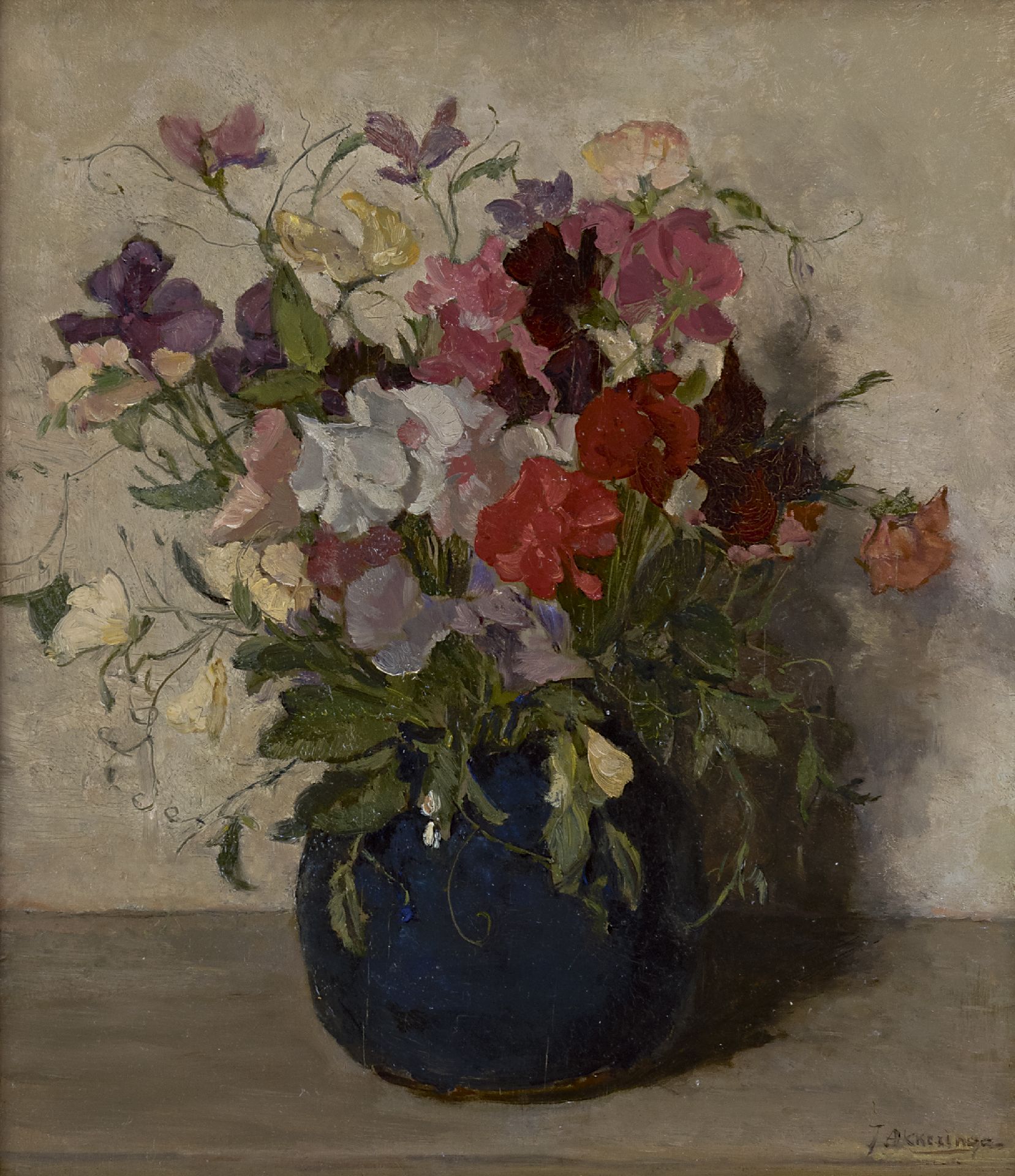 Johannes Evert Akkeringa Kunstwerk • Gemälde • zuvor zu verkaufen Gartenwicke in blauer Vase