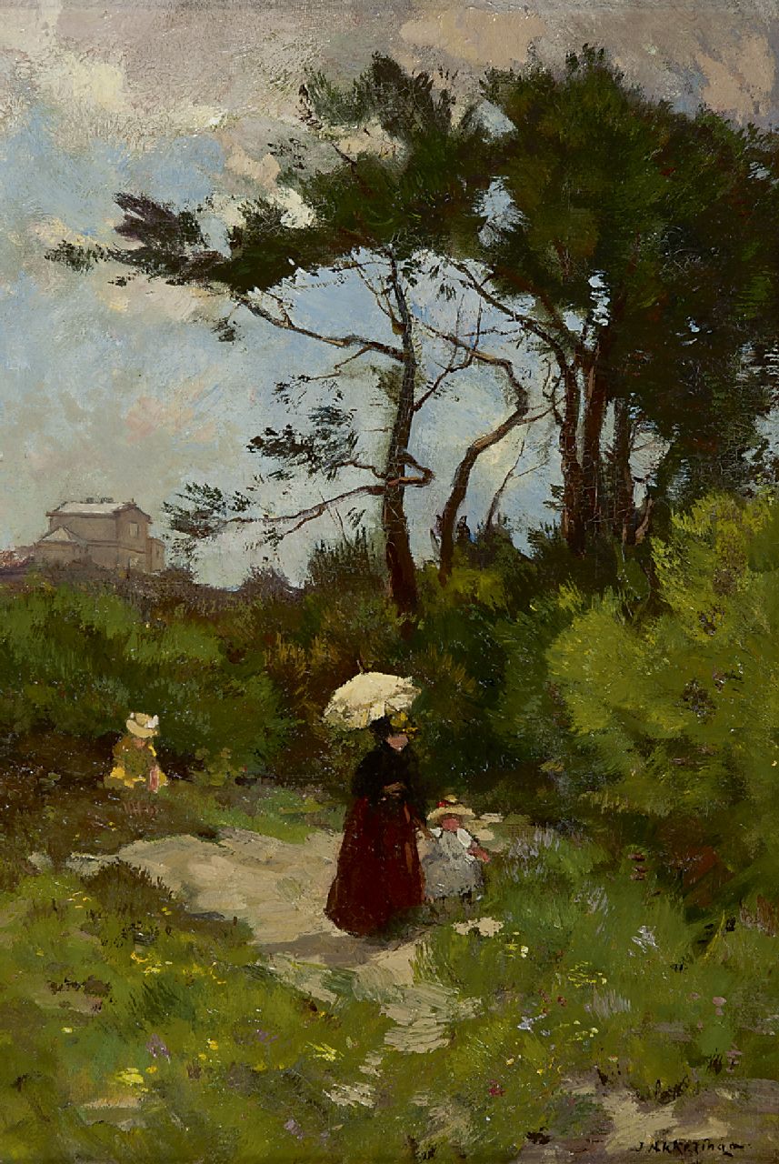Johannes Evert Akkeringa malte wunderschöne Stilleben mit Blumen. Er ist aber vor allen Dingen um seine Dünen- und Strandansichten mit Fischerfrauen und Kindern bekannt geworden. Es sind oft heitere holländische Szenen, die Frauen friedlich bei der Arbeit, die Kinder spielend im Sand unter einem blauen Himmel mit hoher Bewölkung. Auch malte er vornehme Haager Kinder, die in den Dünen oder am Strand spielen. Akkeringa rechnet man zu der späten Haagse School.