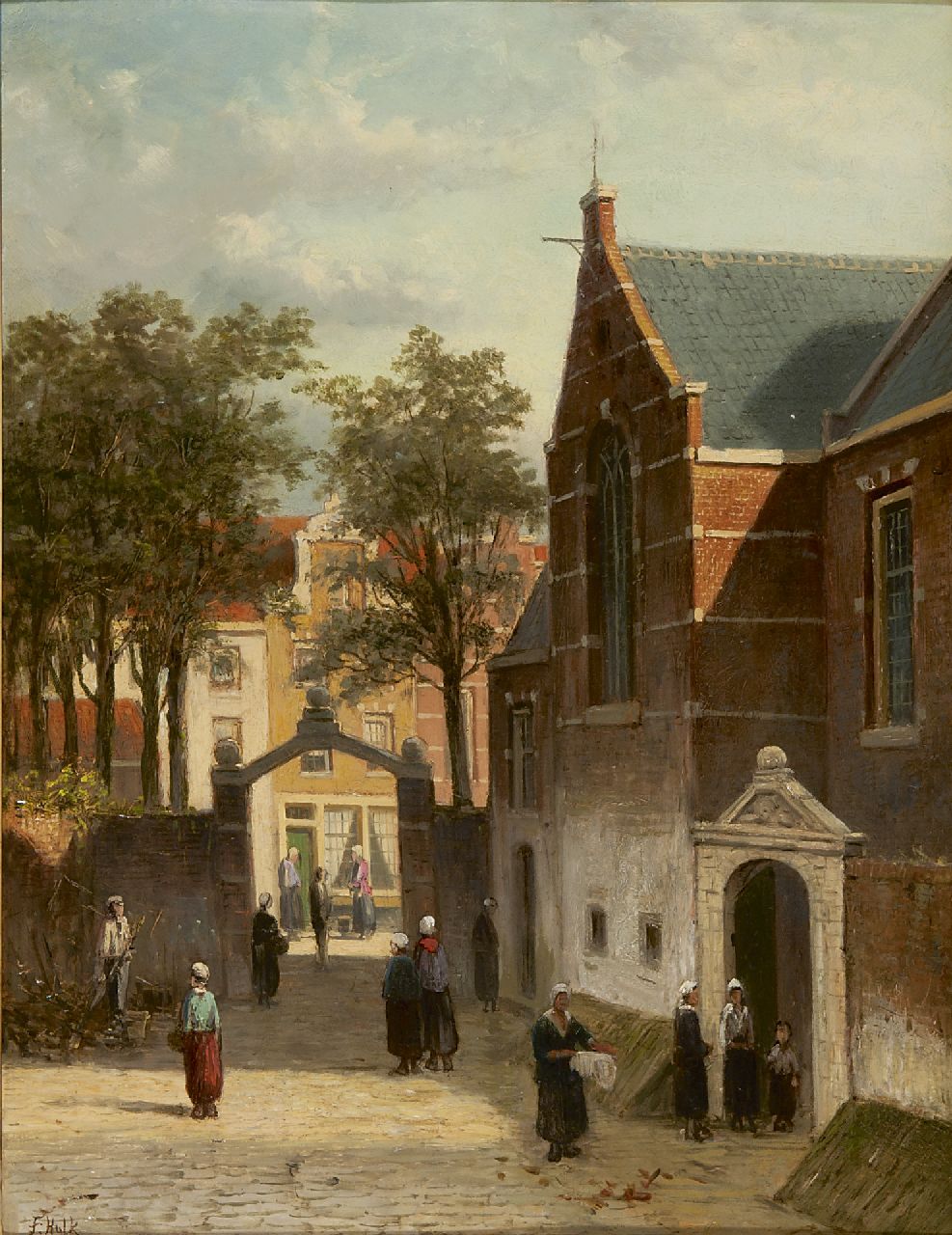 Johannes Frederik Hulk Kunstwerk • Gemälde • zuvor zu verkaufen Lebhaftigkeit auf einem holländischen Kirchplatz