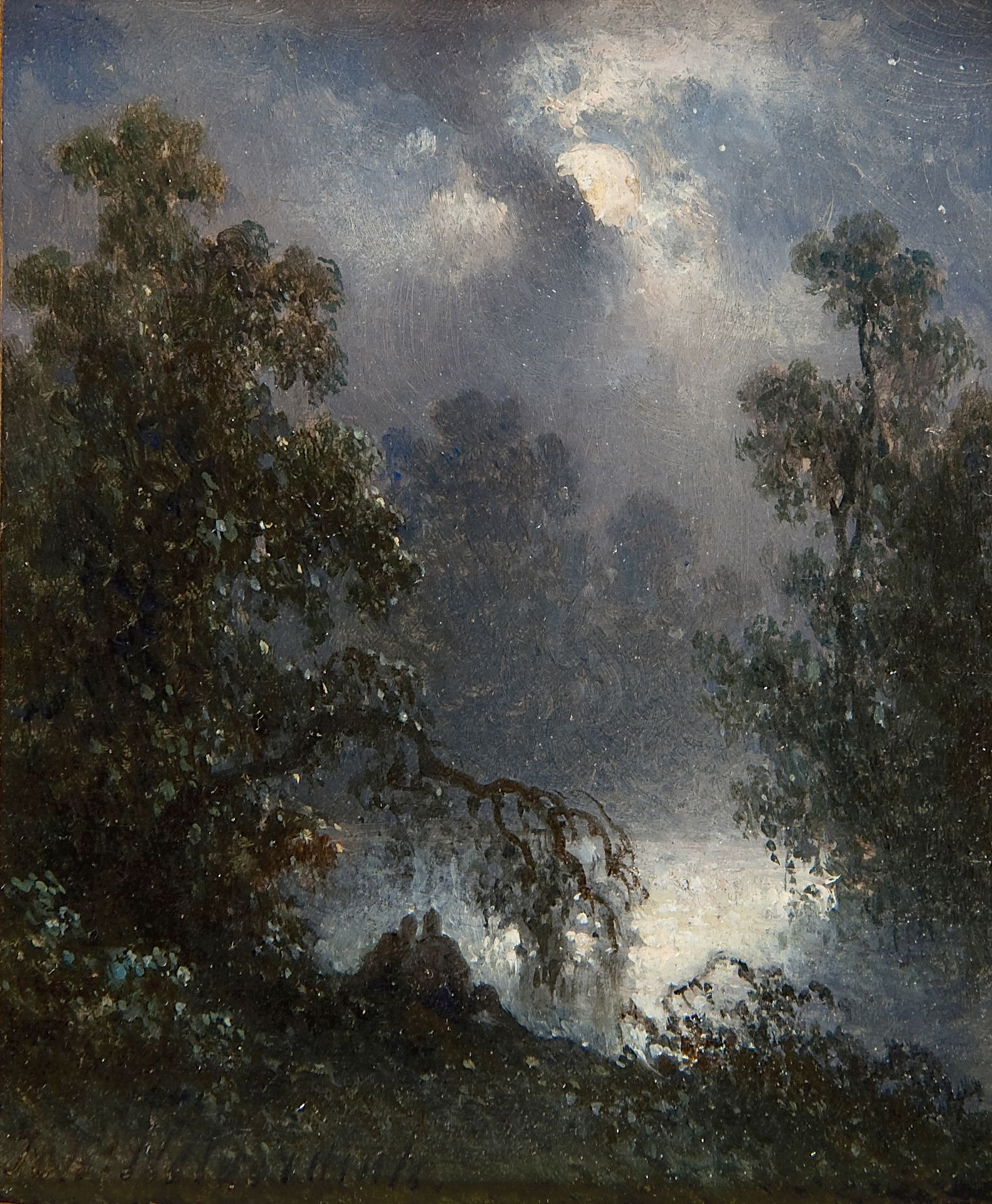 Johannes Hilverdink Kunstwerk • Gemälde • zuvor zu verkaufen A pond with two figures by moonlight