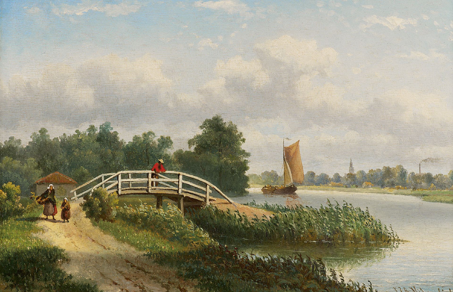 Johannes Jacobus Antonius Hilverdink Kunstwerk • Gemälde • zuvor zu verkaufen A summer landscape with figures along the river