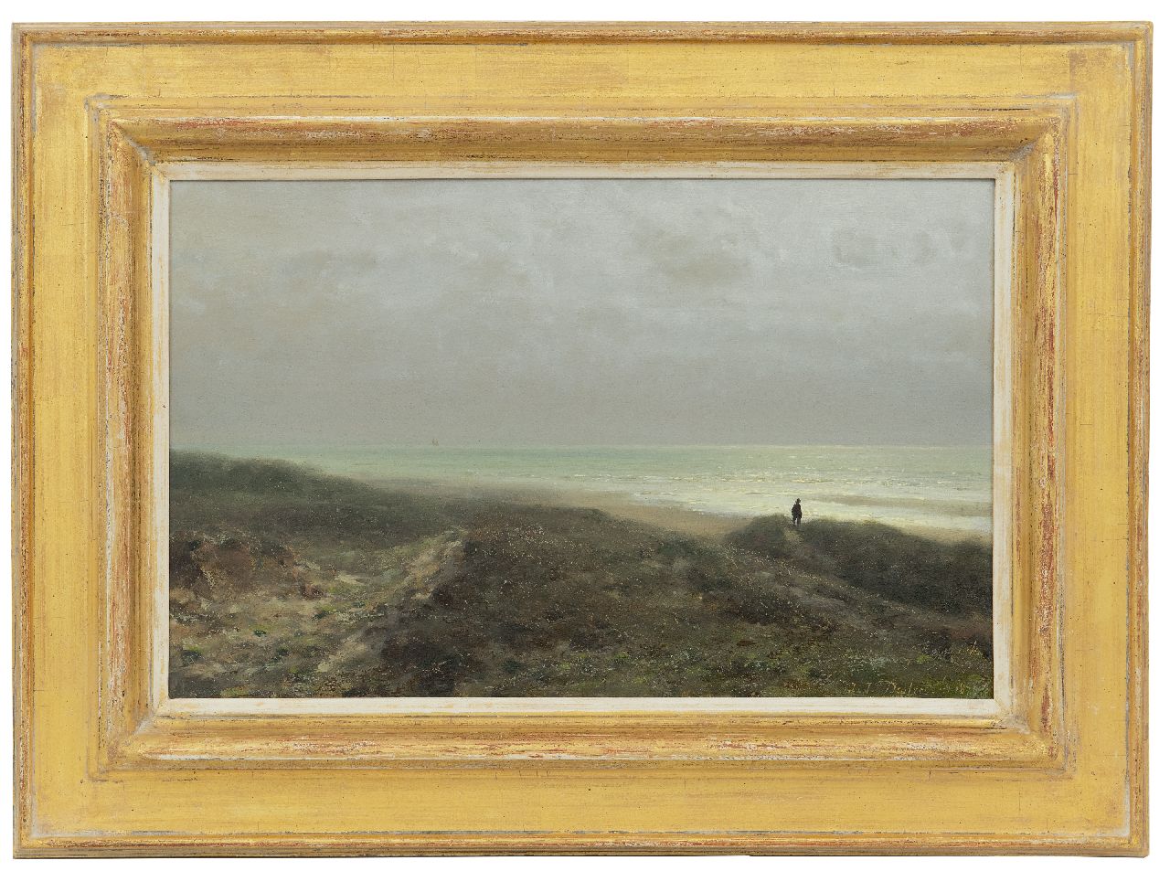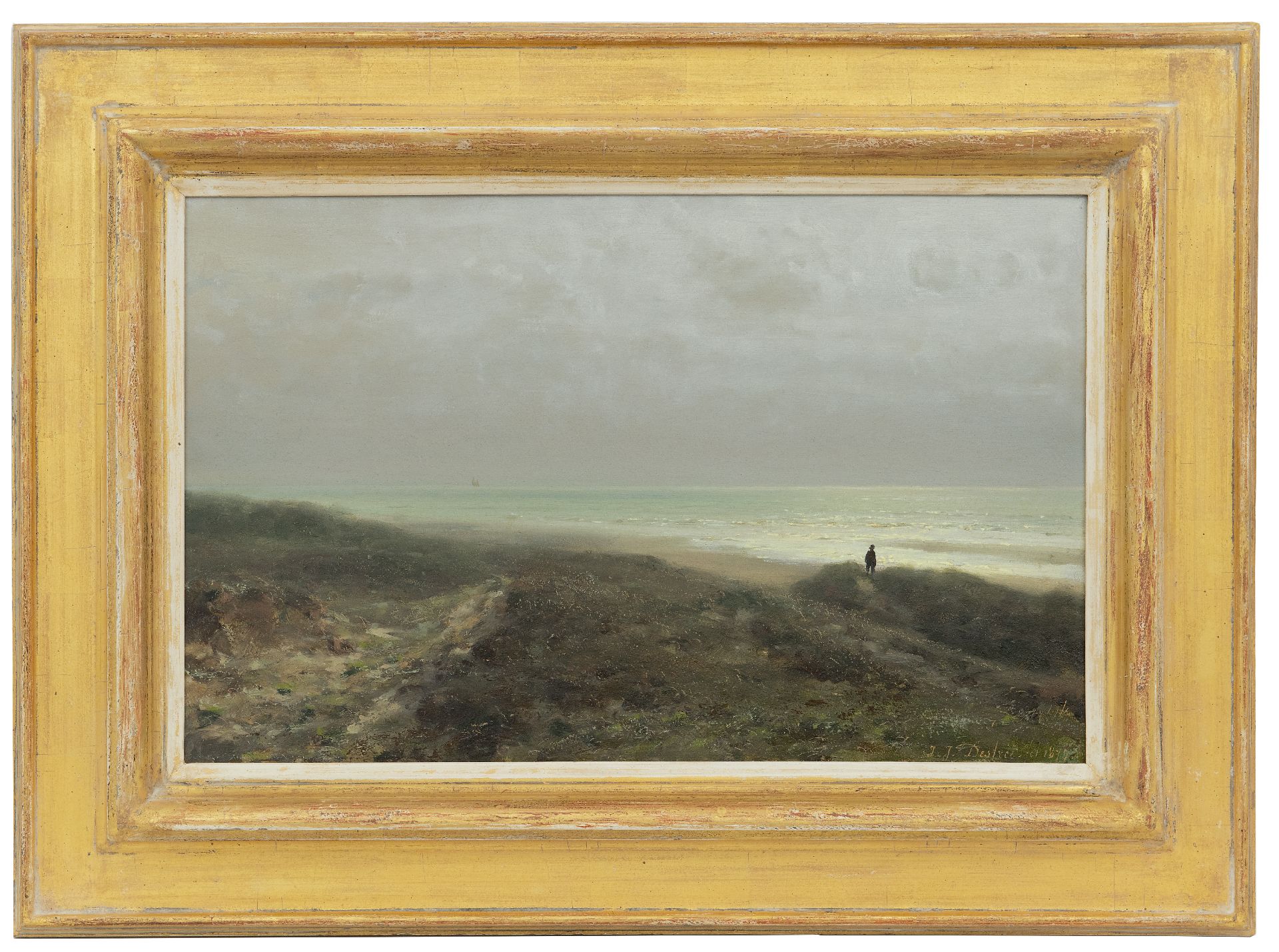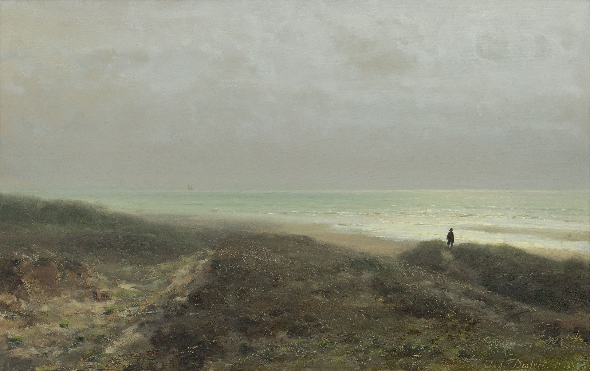 Johannes Josephus Destrée Kunstwerk • Gemälde • zuvor zu verkaufen Dünenlandschaft mit Spaziergänger der aussieht über das Meer