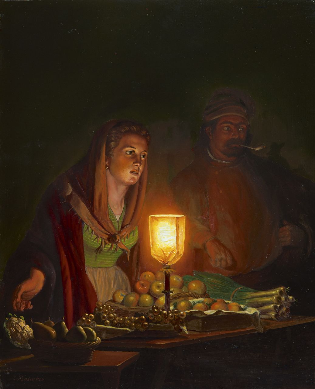 Johannes Rosierse Kunstwerk • Gemälde • zuvor zu verkaufen Abendmarkt mit Obst- und Gemüseverkäufern