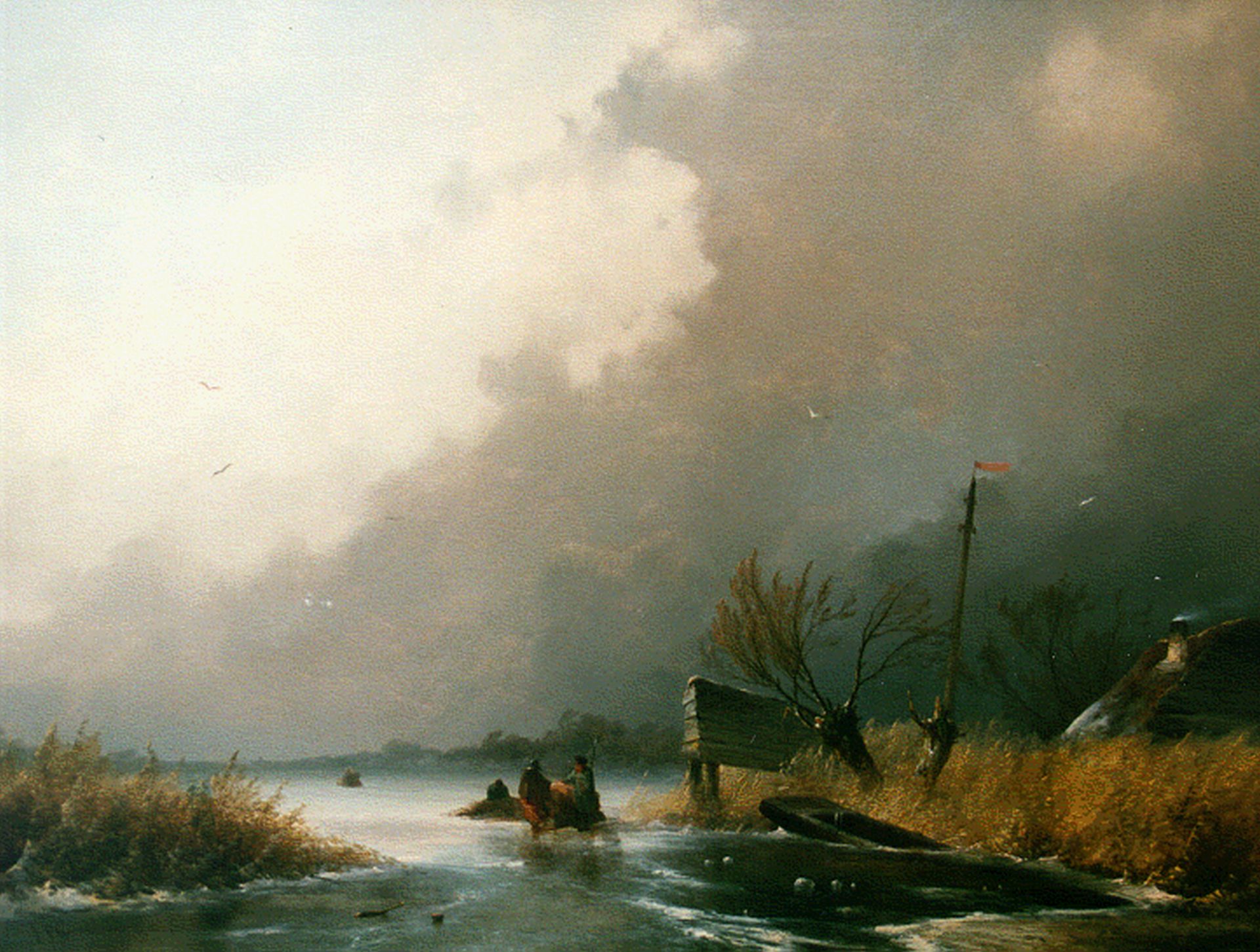 John Franciscus Hoppenbrouwers Kunstwerk • Gemälde • zuvor zu verkaufen A frozen waterway with skaters on the ice
