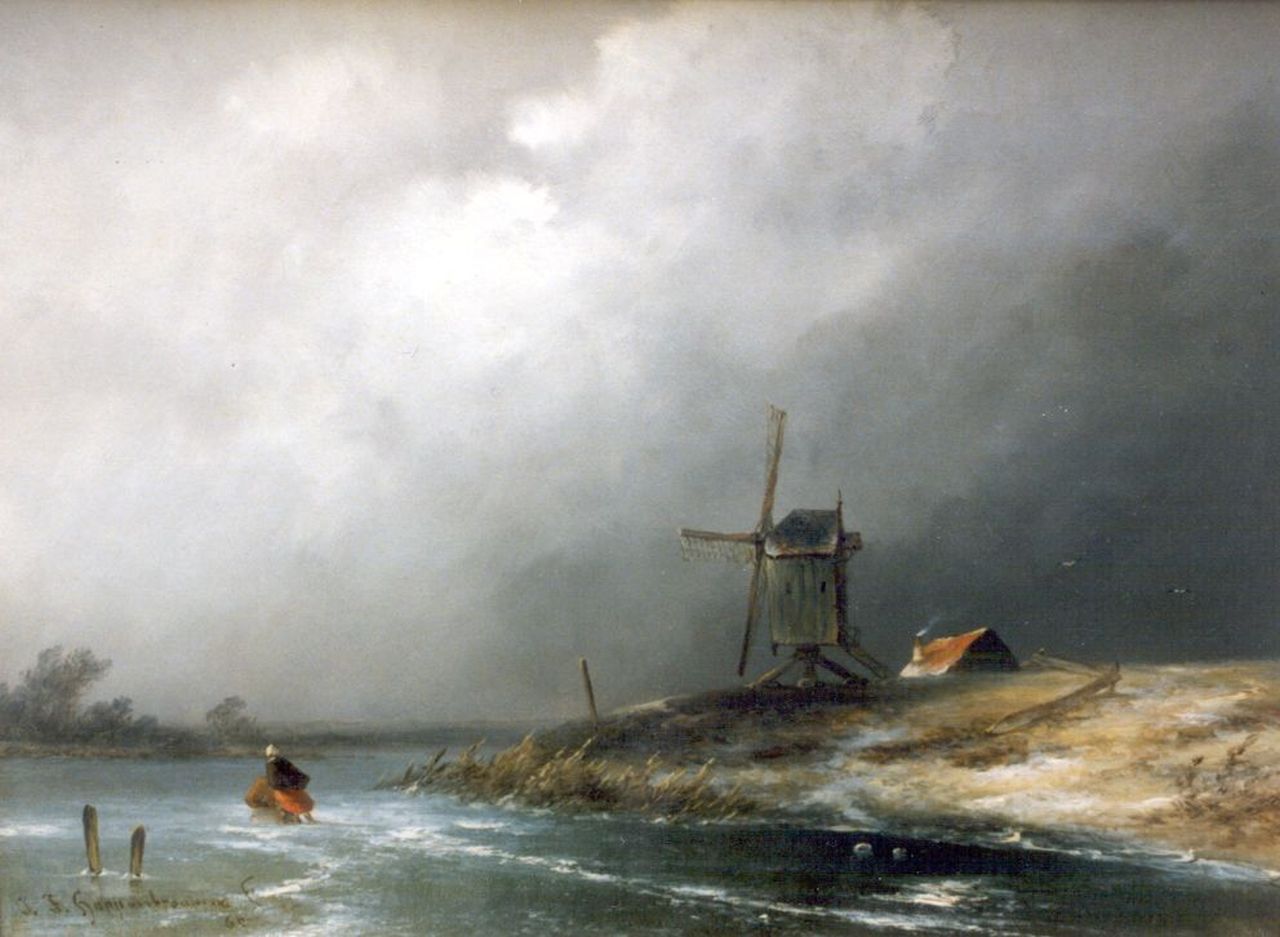John Franciscus Hoppenbrouwers Kunstwerk • Gemälde • zuvor zu verkaufen A skater on a frozen waterway