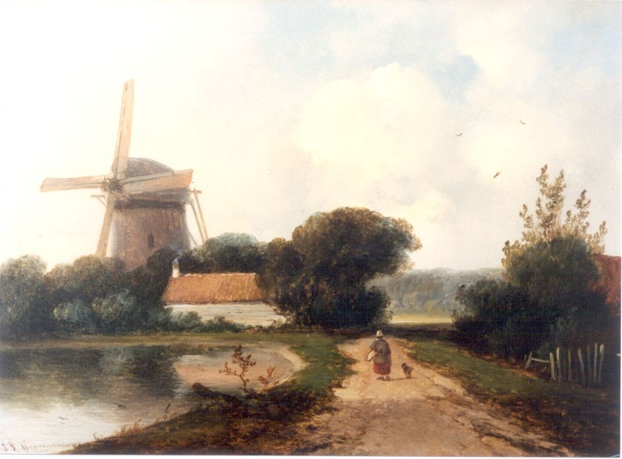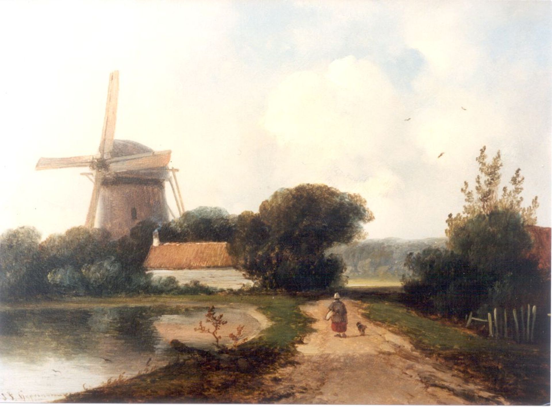 John Franciscus Hoppenbrouwers Kunstwerk • Gemälde • zuvor zu verkaufen A summer landscape with a windmill along a waterway