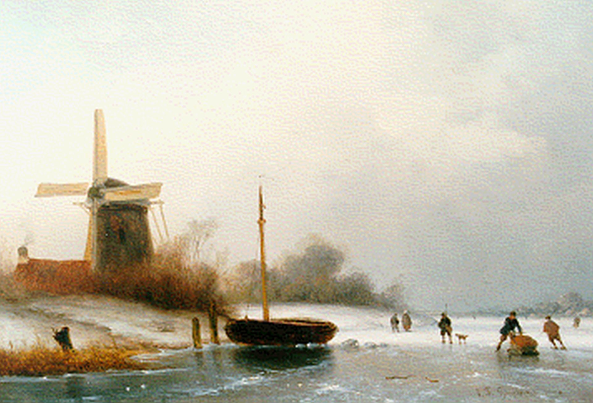 John Franciscus Hoppenbrouwers Kunstwerk • Gemälde • zuvor zu verkaufen A winter landscape with skaters on the ice