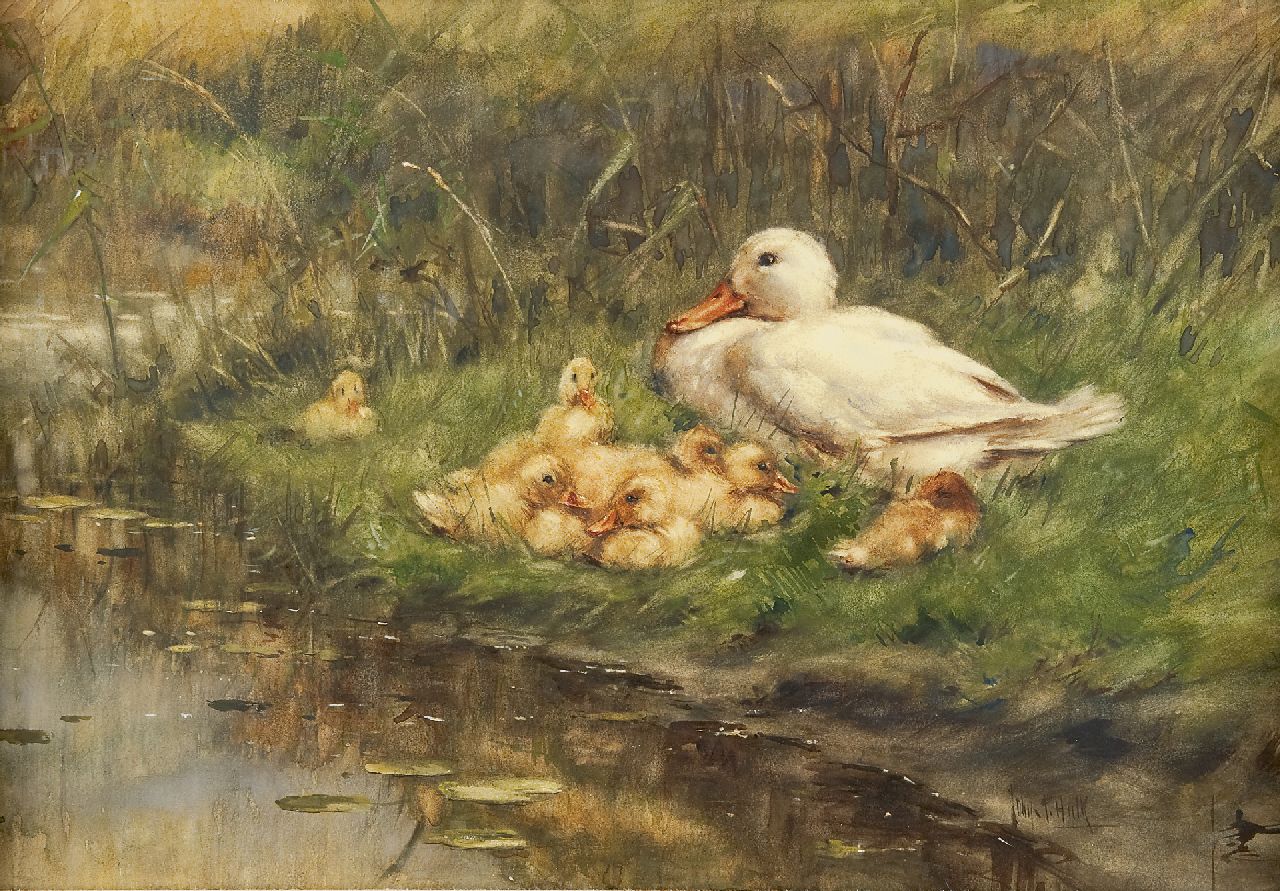 John Hulk jr. Kunstwerk • Aquarell • Zeichnung • zuvor zu verkaufen Entenmutter mit Küken am Ufer