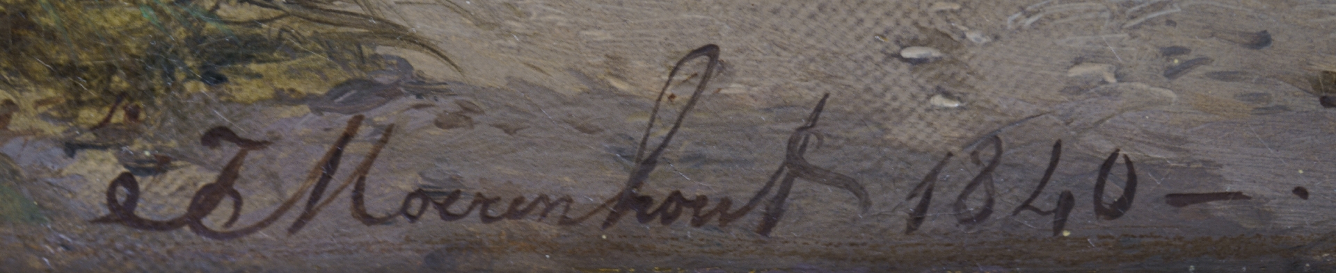 J.J. Moerenhout war ein belgischer Maler von Strandszenen und Landschaften, oft mit Pferden gepolstert. Er wurde in Antwerpen von H. van der Poorten und in Paris von Horace Vernet, dem damals bekannten Maler der Geschichte und der Militärszenen, ausgebildet. 1824 und zwischen 1831 und 1853 lebte er in Den Haag. In dieser Zeit polsterte er auch Arbeiten von Andreas Schelfhout und Louis Meijer.