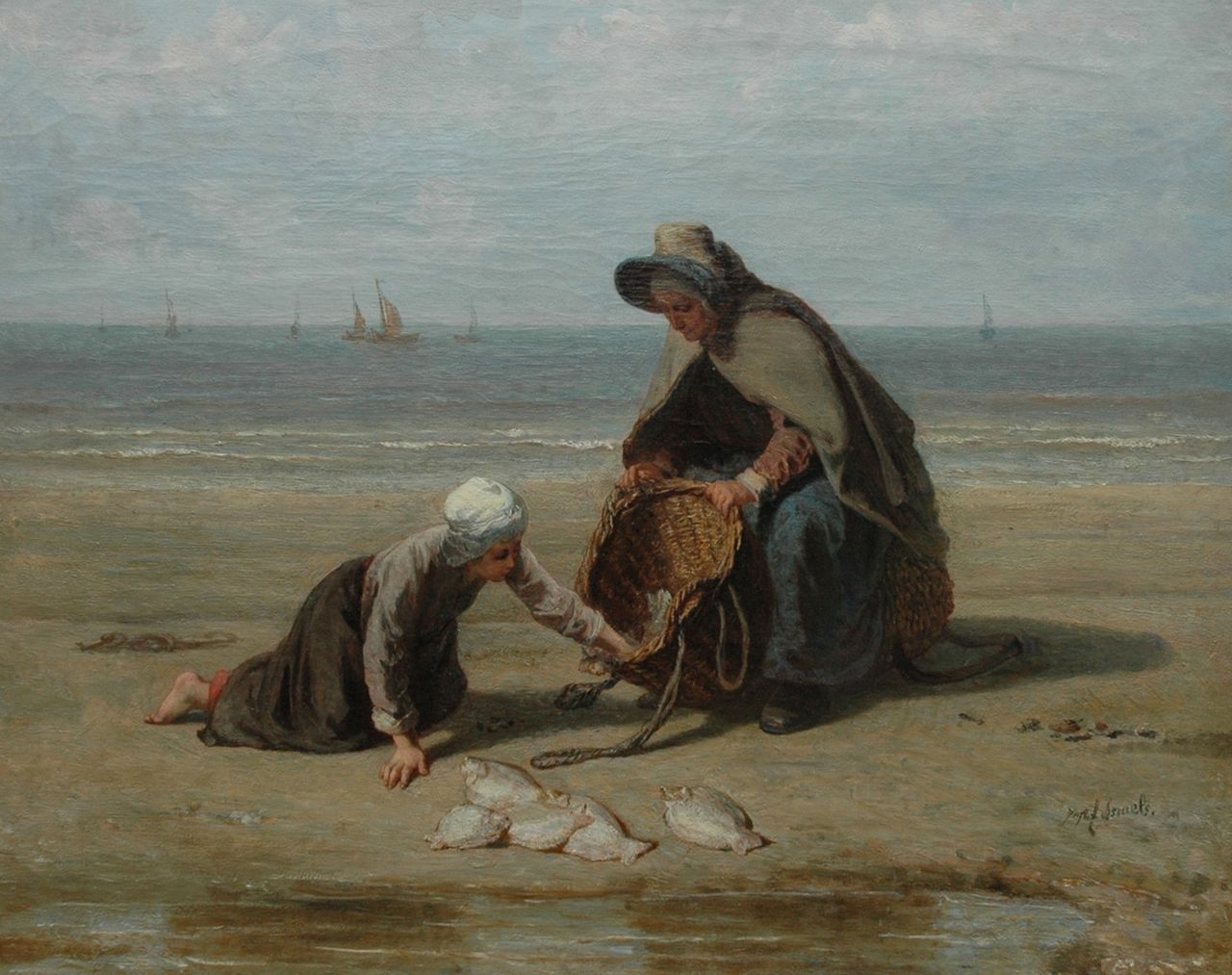 Jozef Israëls Kunstwerk • Gemälde • zuvor zu verkaufen Fisherman's wife and daughter on the beach with the daily catch