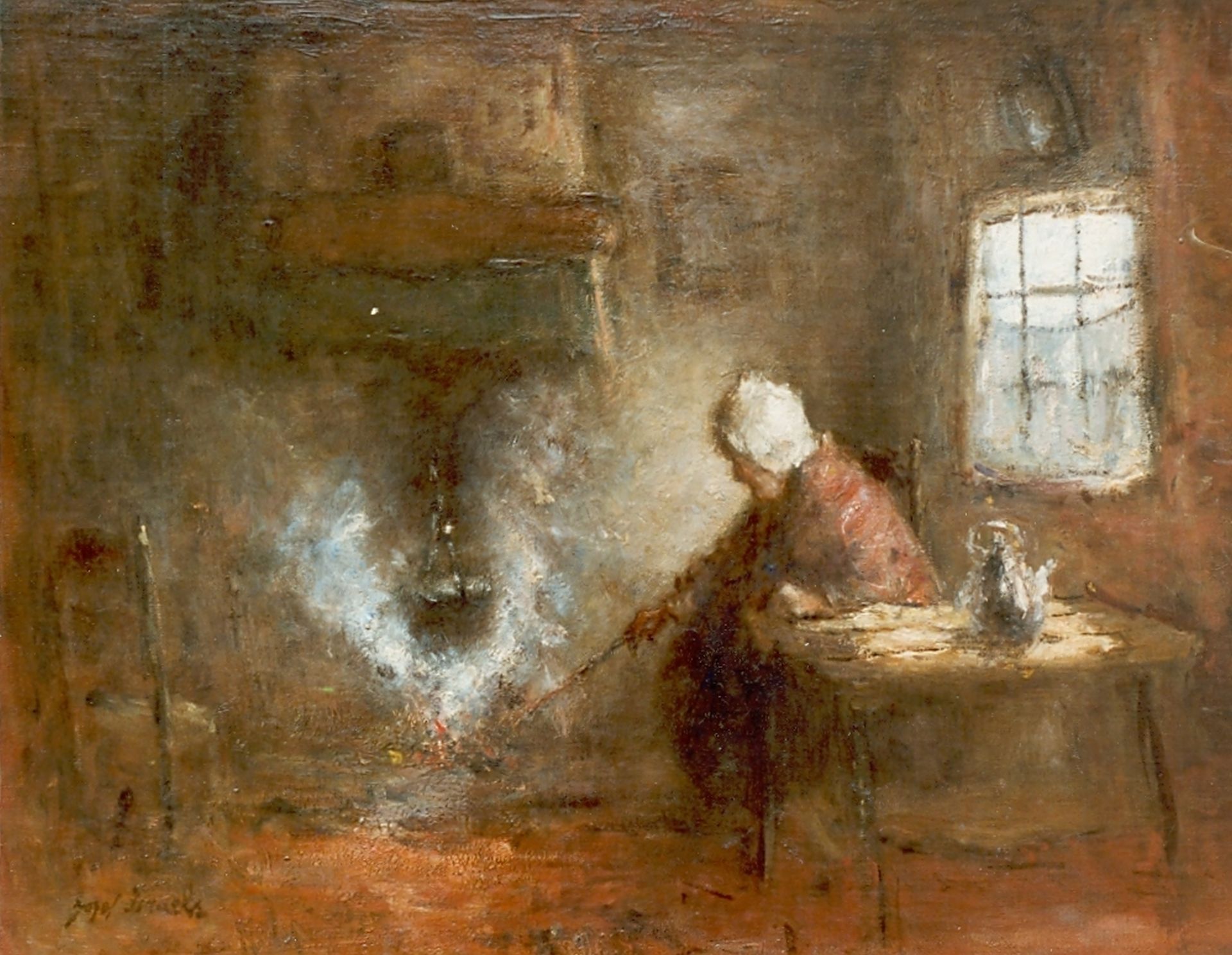 Jozef Israëls, der Nestor der Haagse School, war Schüler von J.A. Kruseman und von der Rijksacademie in Amsterdam. Von 1845 bis zum Jahre 1847, und später im Jahre 1853, studierte er in Paris wo er mit dem französischen Realismus Bekanntschaft machte. Von dieser Strömung beeinflusst zog er in den Niederlanden nach Zandvoort und Katwijk und machte das harte Leben der Fischerbevölkerung zu seinem Thema. Als Verlängerung dieser Linie entdeckte er in den siebziger Jahren das ‚malerische‘ Leben der Bauern in der Gooier Umgebung. Schon während seines Lebens hatte Jozef Israëls mit seinen romantisch-realistischen Gemälden sowohl in den Niederlanden als auch im Ausland viel Erfolg