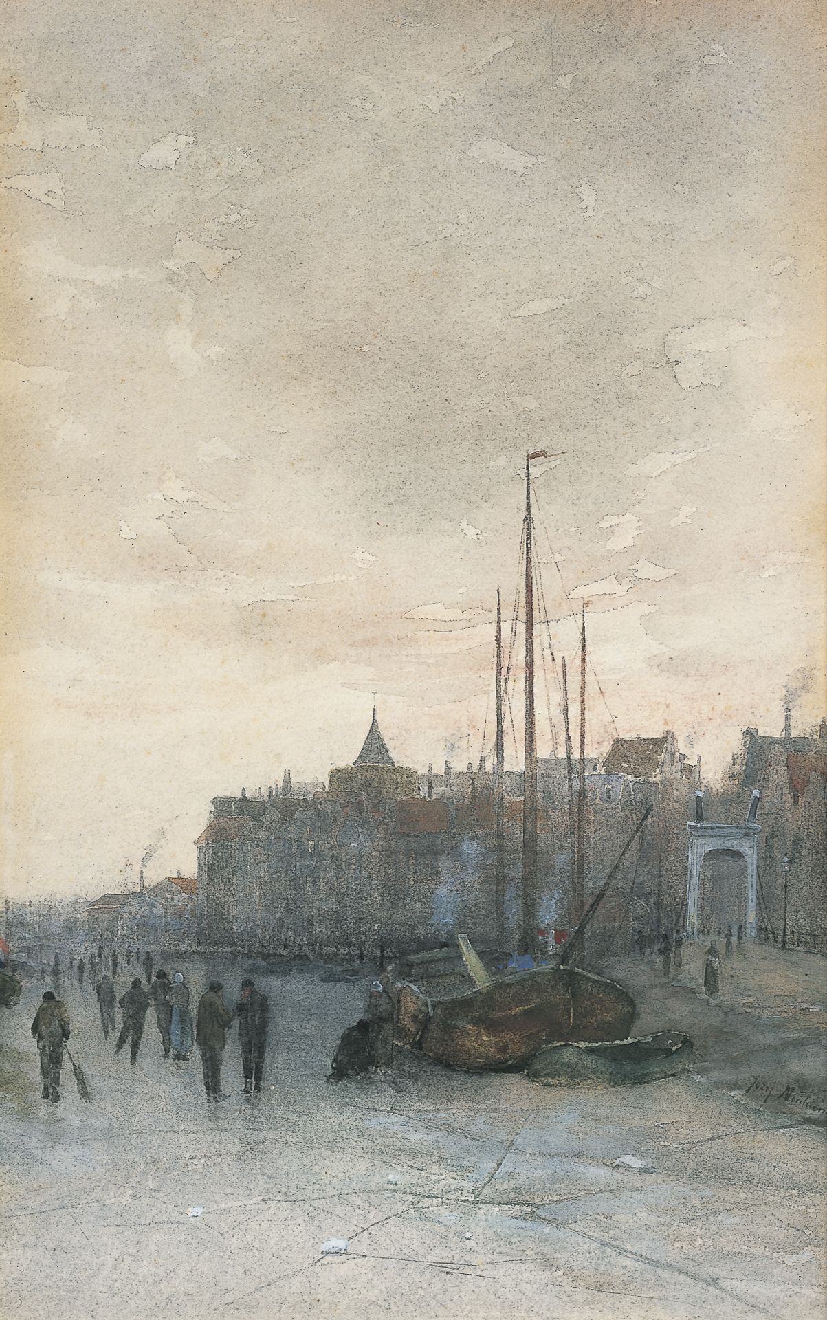 Jozef Neuhuys Kunstwerk • Aquarell • Zeichnung • zuvor zu verkaufen Skaters on the river IJssel, Kampen