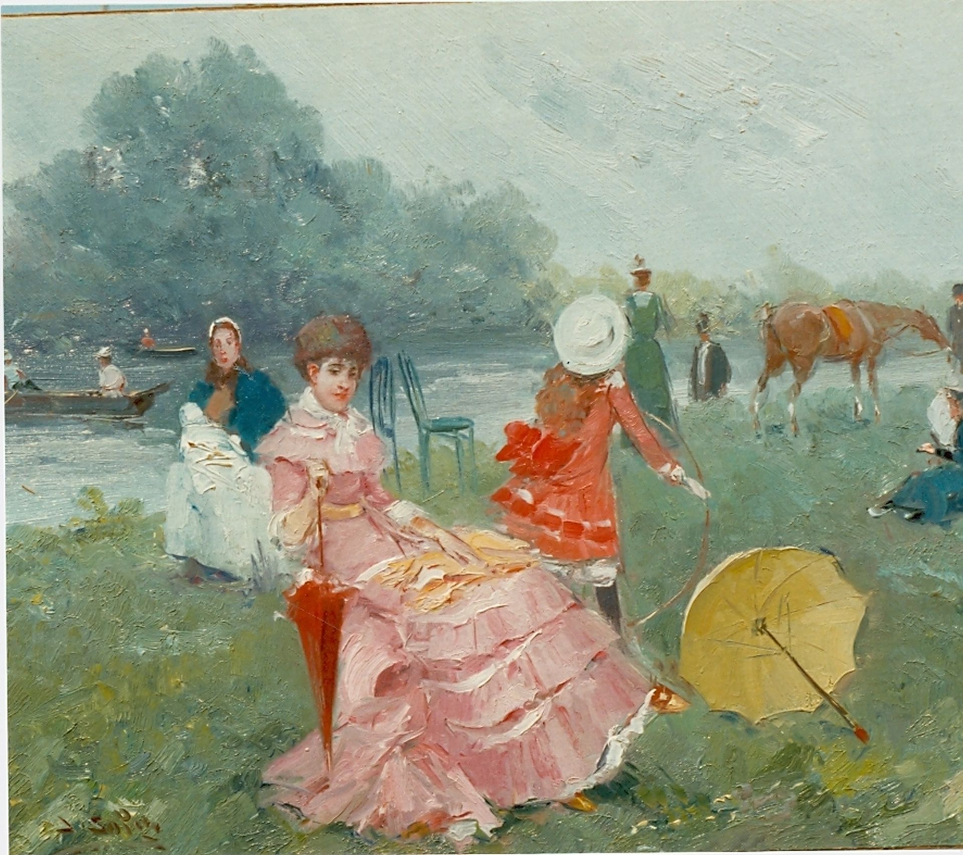 Juan Soler Kunstwerk • Gemälde • zuvor zu verkaufen Elegant figures on the riverbank